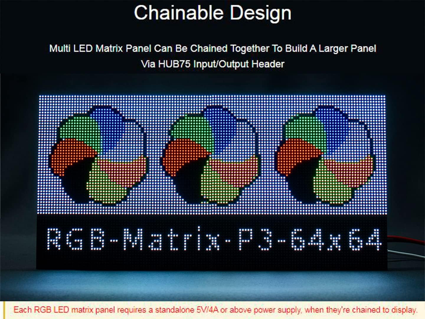 64×64 Flexible RGB LED Matrix Panel,4096 Individual RGB LEDs, 3mm Pitch, Flexible PCB.Supports Raspberry Pi / Raspberry Pi Pico / ESP32 / for Arduino. Features Obviously, the Full-Color LED Matrix Panel is playing an important role. Maybe be on the doors of shops, maybe be on the bus or the taxi, you can always see animations or advertisement videos. Does it look cool? Why not have a try? 4096 individual RGB LEDs, full-color display, adjustable brightness Flexible PCB material, can be gently bent and suitable for some application scenarios such as cylinders, spheres and other curved surface 64×64 pixels, 3mm pitch, allows displaying text, colorful image, or animation 192×192mm dimensions, moderate size, suitable for DIY desktop display or wall mount display Onboard two HUB75 header, one for controller data input, one for output, chain support Provides open source development resources (examples for Raspberry Pi / Raspberry Pi Pico / ESP32 / Arduino) Specifications DIMENSIONS: 192mm x 192mm PIXELS: 64×64=4096 DOTS PITCH: 3mm PIXEL FORM: 1R1G1B VIEWING ANGLE: ≥140° CONTROL TYPE: synchronization DRIVING: 1/32 scan HEADER: HUB75 POWER SUPPLY: 5V / 4A (VH4 header input) POWER: ≤20W Chainable Design: Multi LED Matrix Panel Can Be Chained Together To Build A Larger Panel,Via HUB75 Input/Output Header Usage Scenarios: Flexible PCB Material, Lighter And Thinner, Can Be Gently Bent And Suitable For Some Cylindrical, Circular And Curved Surfaces, Or Other Creative LED Display Shapes Online Development Resources /User Manual ://bit.ly/3Do4olF Package Content RGB-Matrix-P3-64x64-F LED matrix and accessories x1 Power supply terminal adapter x1 16P wire ~30cm x1 Note: The flexible PCB can be gently bent but do not bend it excessively or repeatedly,otherwise, it is easy to be damaged.