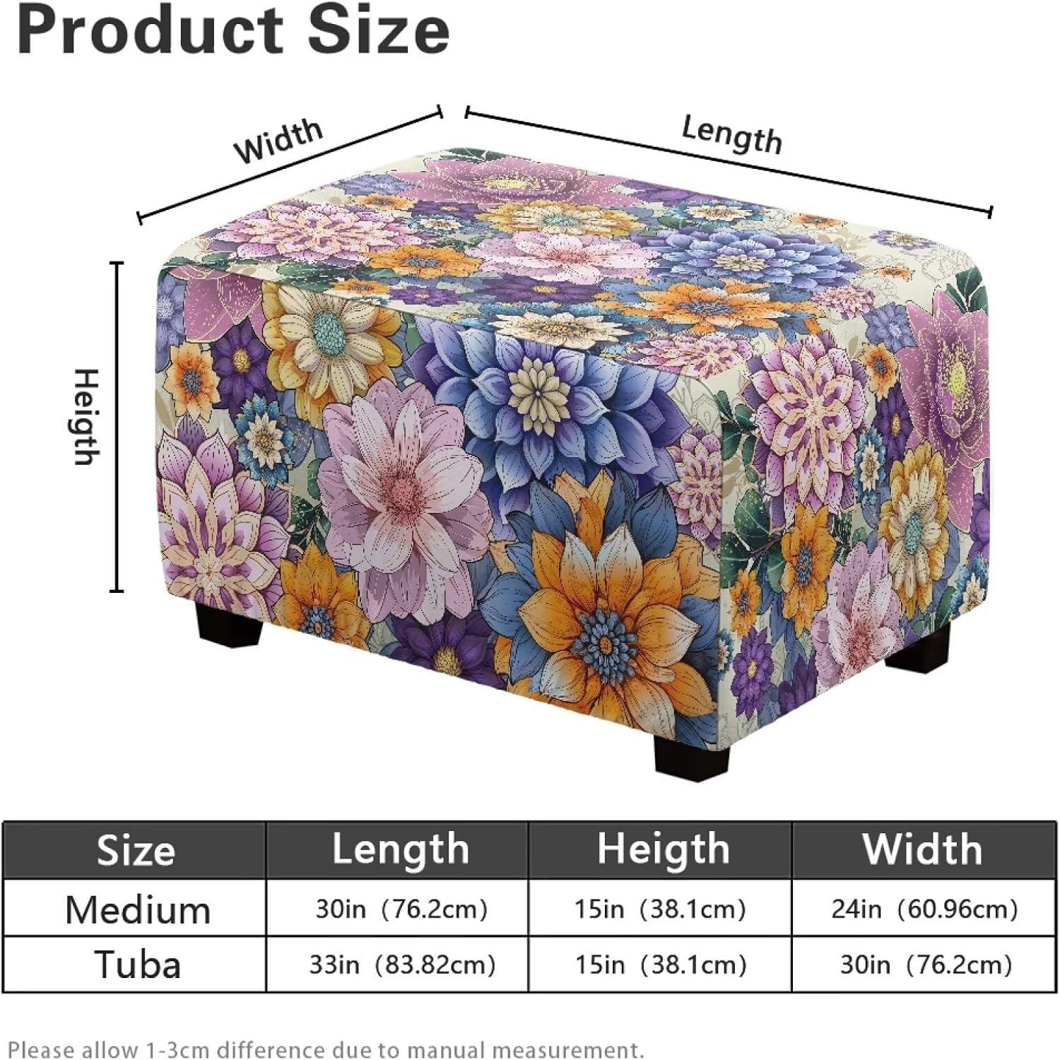 Materia: polyester, spandex Size: suitable for ottoman footstools within the size range: S/Medium: 30 inch/76.2 cm long, 24 inch/60.96 cm wide L/Tuba: length 33 inch/83.82 cm, width 30 inch/76.2 cm Height/Thickness: 15 inch/38.1 centimeters (height should be for the cushion portion of the bench only (not including the legs)) Patterns: Floral, Geometric, Boho, Leaves, Tropical Elements, Animal Prints, etc. Features: stretch fabric, machine washable, waterproof, wear-resistant and breathable. Sewn elastic band at the hem, play a whole, tight protection, easy to install and remove, without the help of others, a person can easily and quickly installed, the cover is not easy to slip off or deformed Function: The bench cover can cover the stains and dust in daily life, keep your bench new and clean, reduce the damage, prevent pollution. Slow down the aging and yellowing speed of your bench surface. It is the most cost-effective way to protect your furniture and upholstery from everyday tears, scratches, spills and stains. There are a variety of personalized patterns for you to choose from, perfect for vintage style, Scandinavian style, minimalist style and other different home decorating styles, suitable for study, living room, bedroom, children's room, office, etc., is a thoughtful gift for housewives, friends, spouses, children's birthdays, housewarming, Christmas, Thanksgiving, Easter, St. Patrick's Day, Halloween, housewarming, New Year's Eve and other special festivals This size data due to different measurement methods, the error of 1-2cm within the normal phenomenon!