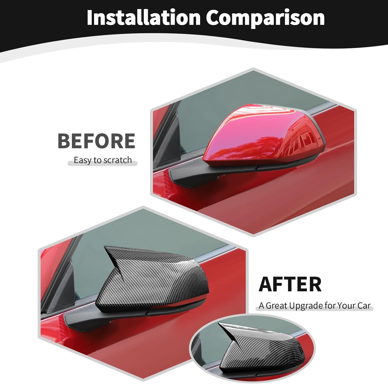 • [HIGH QUALITY] JOSHELA for Mustang Black Carbon Fiber Outside Mirror Cap Trim Cover made of high-quality ABS plastic and used polish process for deformation protection, anti-corrosion, and years of trouble-free use