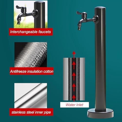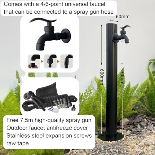 The garden water column is designed to enhance your outdoor experience with its sleek black finish, crafted using high-temperature baking paint technology. This modern and elegant fixture seamlessly fits into any courtyard or garden setting, adding a touch of sophistication. Engineered with antifreeze capabilities, it effectively prevents ice buildup during cold weather, ensuring reliable performance throughout the seasons. Constructed with a stainless steel inner tube and insulated with aluminum foil cotton, this water column combines durability with energy efficiency. Its sturdy, thickened round base and robust stainless steel plate facilitate easy ground installation, making it suitable for year-round use. The stainless steel faucet is perfect for various gardening tasks, whether you're watering plants in your backyard, maintaining a school garden, or managing a farm's irrigation system. Included in the package is one garden faucet water column along with a 7.5-meter spray gun, providing you with everything you need for effective watering. With dimensions of 60*6CM, this versatile water column is available in multiple faucet specifications and features both side and bottom water inlet options for flexible installation. Please note that due to manual measurement, a slight deviation of 1-2cm may occur. Additionally, monitor display differences may affect color perception, so the actual product color may vary. This product includes only the water column and its accessories, making it a practical choice for those looking to enhance their gardening experience.