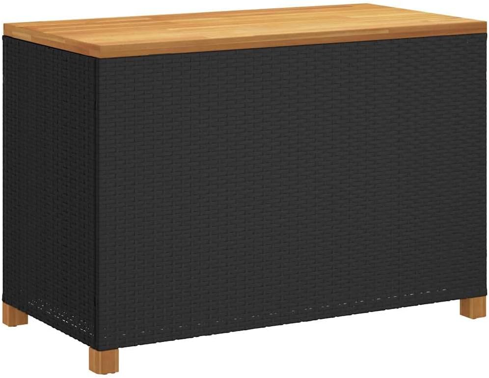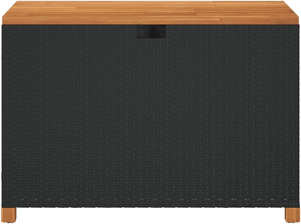 This outdoor storage box mixes practicality with a modern look, making it a fab addition to your garden or patio. Its sleek black and brown finish, along with a sturdy design, means it’s great for holding cushions, blankets, and garden tools, while also doubling up as a comfy seat for your outdoor hangs.This storage box has loads of space perfect for cushions, blankets, and gardening tools, keeping everything neat and easy to grab all year round.Made from tough materials, it has solid acacia wood and a strong poly rattan design, ensuring it lasts through all sorts of weather.Weather-proof and UV-protected, you can count on your items staying dry and shielded from the sun, making it good for both indoor and outdoor use.The smooth finish and modern look allow it to fit right in with any patio furniture, giving you a stylish and functional solution for outdoor storage.Its handy shape and size make it perfect for balconies, gardens, and garages, providing storage and a comfy seat when you need it.Color: Black Shape: RectangularMaterial: Synthetic Poly RattanFinish: Oiled Indoor/Outdoor: Indoor / OutdoorRoom: Garden and terraceCapacity: Space for blankets, cushions, and toolsMaximum Number of People: 2Maximum Weit: 706 lbsDimensions: 21.7 x 43.3 x 24.8 in (W x L x H)Weight: 32.63 lbsDelivery Contains: Storage Box, Water-resistant BagAssembly Required: YesRecommended Number of People for Assembly: 2