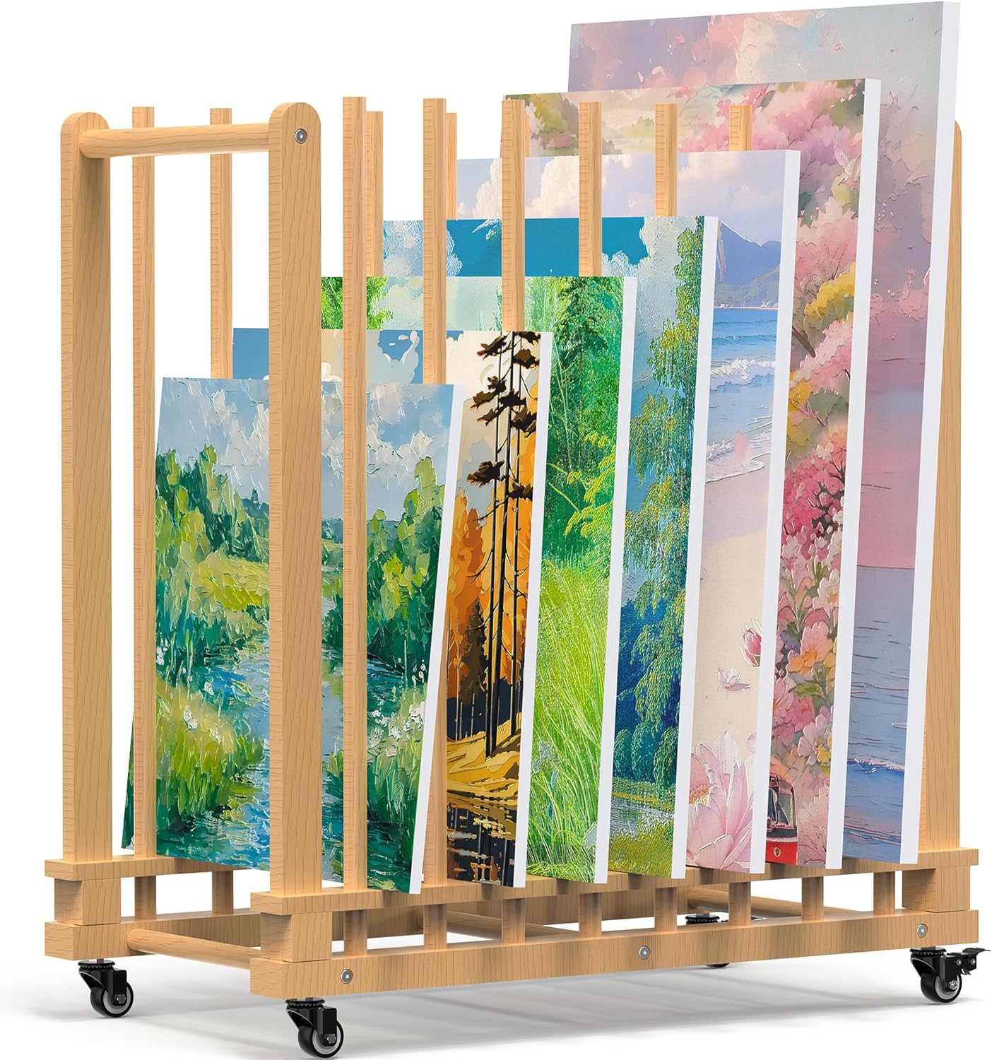 GARVIN Premium Beech Wood Art Storage & Drying Rack — a mobile, gallery-grade solution that stores, protects, and displays your canvases with ease. Built for creators who want a clean workflow and a studio that works as beautifully as it looks.Why Beech, Not Cheap Pine: Our dense beech wood frame resists warping and cracking far better than low-cost pine. The smooth eco finish and rounded edges help protect canvases and hands, making this a durable wood storage rack you’ll trust for years.Flexible Slot System — Removable wooden dowels let you tailor spacing for thin panels or thick stretched canvases; use fewer dowels to maximize capacity. Works as an art storage, canvas organizer, and painting rack for day-to-day workflow.Sized for Real Studios — Compact footprint (approx. 27.9"" x 15.7"") with 32.2"" height and 2.3"" post spacing supports popular canvas sizes(e.g., 15"x15" up to ~33"x33"). Rated load up to 110lb for confident storage.Moves When You Do — Four 360° casters (two lockable) glide smoothly between rooms; lock in place for steady loading. Structure-first base design keeps the rack stable even when fully packed.Store, Dry, Display — Airflow between dividers helps pieces dry, doubling as an art drying rack / painting drying rack. At shows, it becomes a neat art print rack / print display rack to stage finished works.Wide Application — Ideal for Art Studio, Home Office, Gallery, and Classroom. Fits canvas boards, panels, picture frames, cartons, glass plates and more sheet goods—your versatile canvas storage and storage rack solution.Organize Your Creativity: With adjustable spacing, premium materials, and smooth mobility, this rack upgrades chaotic corners into a calm, productive zone—true art canvas storage and canvas rack art storage for serious creators.GARVIN — Built to protect what you create.