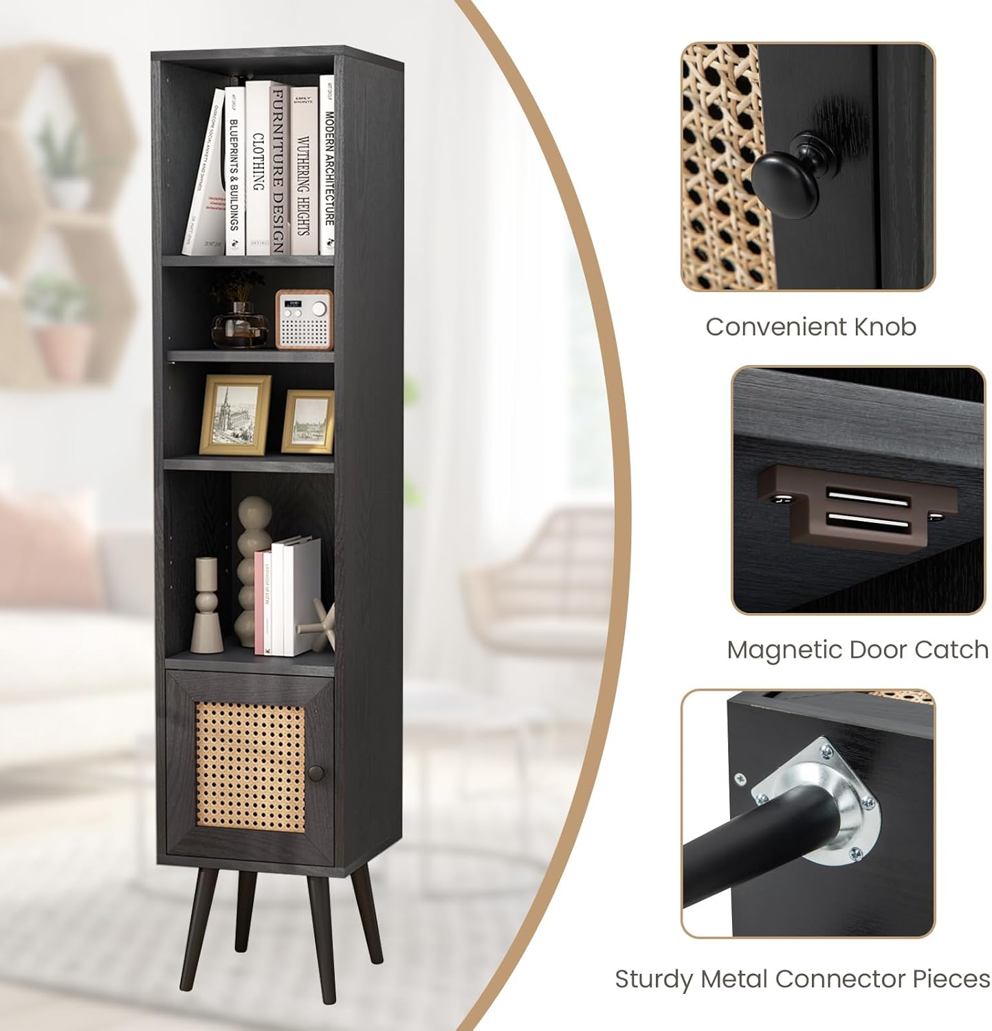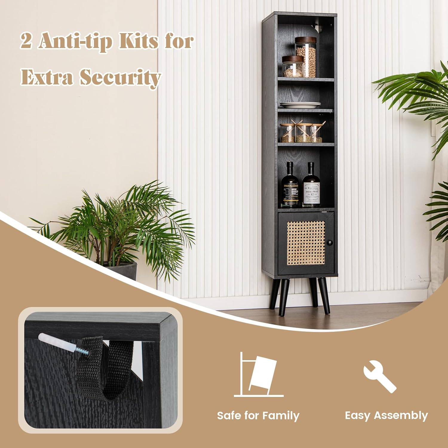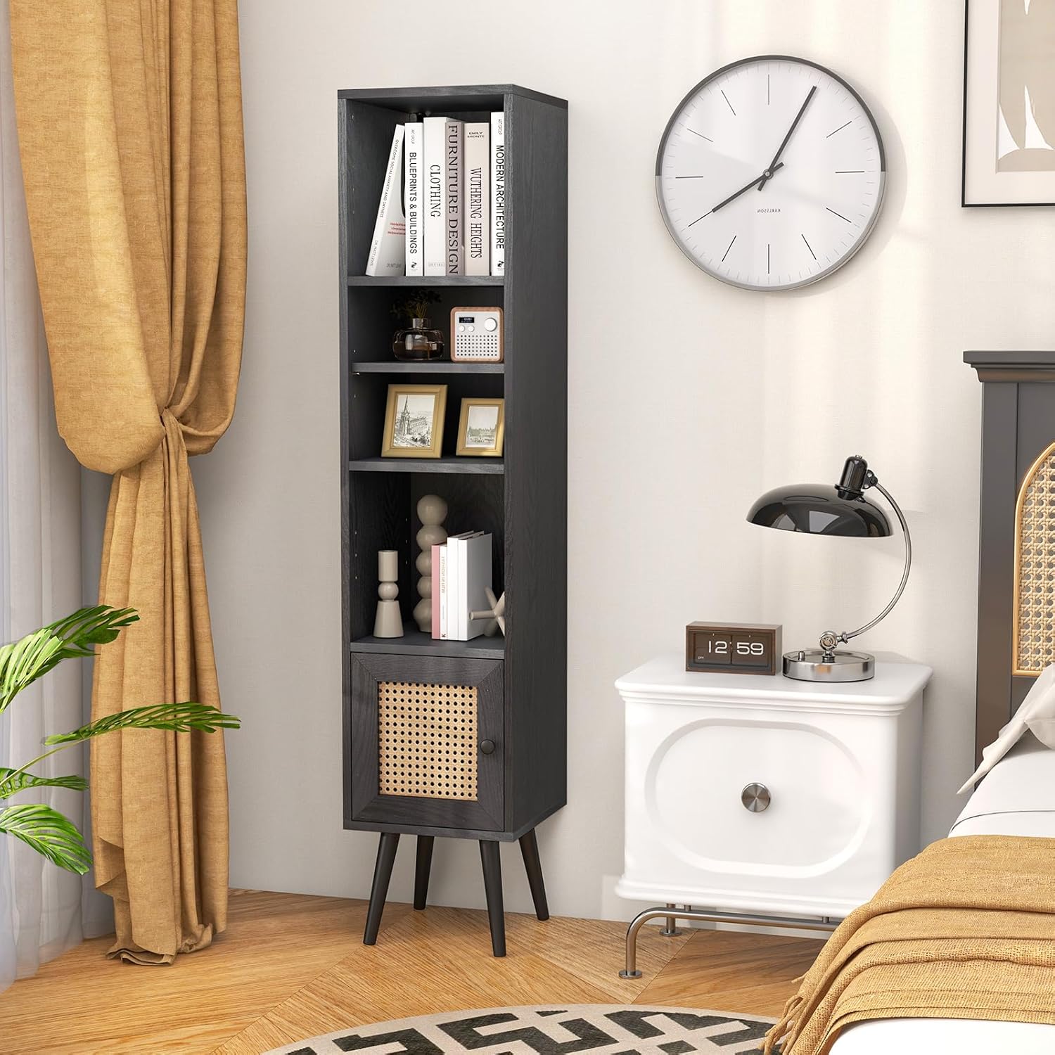 Description: Giantex sturdy and stylish tall Book cabinet is a wise addition to living room, bedroom, dining room, hallway or den. With its slim shape and ample storage space, the unit can serve as a corner bookcase that takes a few floor space while keeps the room clean. Features: Natural rattan door protects privacy while keeps good ventilation A removable shelf with 12 adjustable positions for customized storage space Equipped with 2 anti-tip kits for extra security 4 robust legs made of solid wood offer a long service life Slim and tall cabinet is suitable for small space Specification: Color: Black Material: Engineered Wood, Solid Wood, Rattan Overall Dimensions: 11.5" x 11.5" x 54" (L x W x H) Dimensions of Each Cube: 11" x 10" x 11" (L x W x H) Adjustable Shelf Height of Each Level: 1.2" Clearance from Floor: 6.5" Max Weight Capacity in Total: 135 lbs Net Weight: 31 lbs Package Includes: 1 x Bookshelf 1 x Instruction