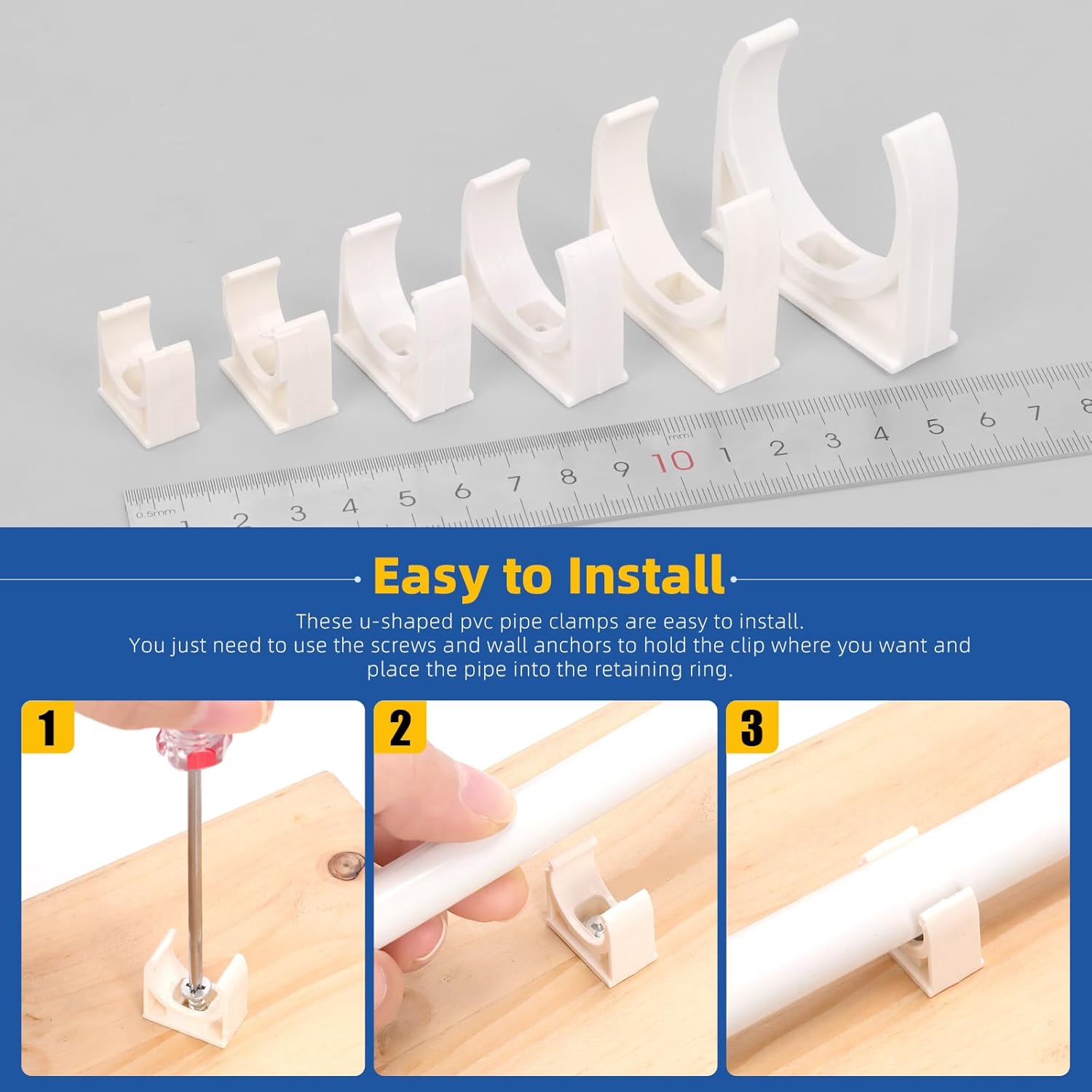 Glarks 140pcs 16/20/25/32/40/50MM U-Shaped PVC Water Pipe Clamps Clips, White Plastic U Pipe Clamp Buckles, PEX Clips Pipe Hangers Pipe Holder PEX Tubing Clamp for Fixing Cable Pipe Gas Pipe Water Pipe 👍 [Specifications]: ➤ Product Type: U-shaped PVC water pipe clamps clips ➤ Material: ABS plastic ➤ Color: White ➤ Size: Center Diameter: 16mm/0.63in, 20mm/0.78in, 25mm/1in, 32mm/1.26in, 40mm/1.57in, 50mm/2in ➤ Quantity: 140pcs 👍 [Product Features]: ☛ 140pcs U pipe clamps, mounting screws and hardware not included! To avoid purchasing incorrectly and not being able to use them correctly, please check that the plastic U pipe clamps match in size! ☛ It is recommended to design the layout of the wire pipe first and draw line markers on the wall or floor. Mark the position of the pipe clamps where they need to be installed. Then install the pipe clamps. ☛ Plastic U pipe clamp tools are made of plastic, which has a certain degree of toughness. They are also suitable for mounting and fixing valves with a high load-bearing capacity. ☛ Select the appropriate PEX clip according to the diameter of the water pipe. The PEX clips will have enough locking force to keep the water pipe in place. And the PEX clips are very easy to maintain and replace. 🧾 [Package Details]: ♥ 30pcs x 16mm/0.63in U-shaped PVC water pipe clamps clips ♥ 30pcs x 20mm/0.78in U-shaped PVC water pipe clamps clips ♥ 30pcs x 25mm/1in U-shaped PVC water pipe clamps clips ♥ 20pcs x 32mm/1.26in U-shaped PVC water pipe clamps clips ♥ 20pcs x 40mm/1.57in U-shaped PVC water pipe clamps clips ♥ 10pcs x 50mm/2in U-shaped PVC water pipe clamps clips ♥ 1pcs x storage box ♥ Total: 141pcs 🥇 [Note]: ※Manual measurement, please allow a little error.