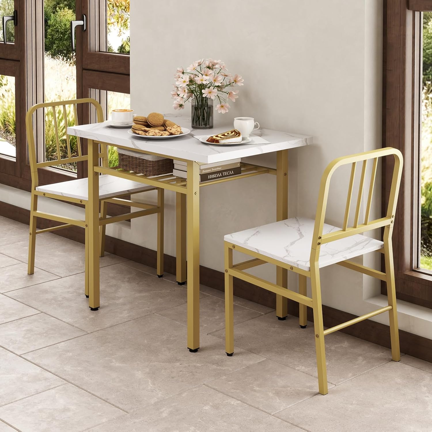 Description:Discover elegance and functionality combined in this 3-piece dining table set, designed to effortlessly fit into small spaces. The sturdy metal frame paired with adjustable foot pads provides rock-solid stability for your dining experience. The dining chairs can be tucked under the table when not in use to maximize your dining space. Adding to its functionality is a handy storage shelf under the table, perfect for storing dining essentials within reach yet out of sight. What’s more, the ergonomic backrest offers cozy support. Whether placed in kitchen, restaurant, or cafe, this dining room set is crafted to offer durability, style, and convenience.Features:Sturdy metal legs ensure durability2 chairs can be placed beneath the table to fit small spacesIntegrated storage shelf under the table keeps items within reachAdjustable foot pads for balance on uneven surfacesReinforced bars increase overall stabilityTilt backrest offers optimal comfort during dining sessionSmooth tabletop is easy to cleanSpecifications:Color: Grey & Black/ Rustic Brown & Black/ White & GoldMaterial: Engineered Wood, Metal Table Dimension: 31.5" x 21" x 30" / 80 x 53 x 76 cm (L x W x H)Storage Shelf Size: 21.5" x 19" / 54 x 48 cm (L x W)Chair Dimension: 17.5" x 16" x 31.5" / 45 x 40 x 80 cm (L x W x H)Seat Dimension: 16" x 15" / 40 x 38 cm (L x W)Seat Height: 17.5"/45 cmNet Weight: 42 lbs / 19 kgTable Weight Capacity: 200 lbs / 91 kgChair Weight Capacity: 330 lbs / 150 kgPackage Includes:1 x Dining Table2 x Dining Chairs1 x Instruction