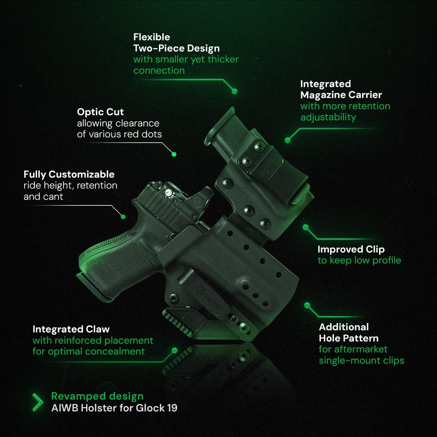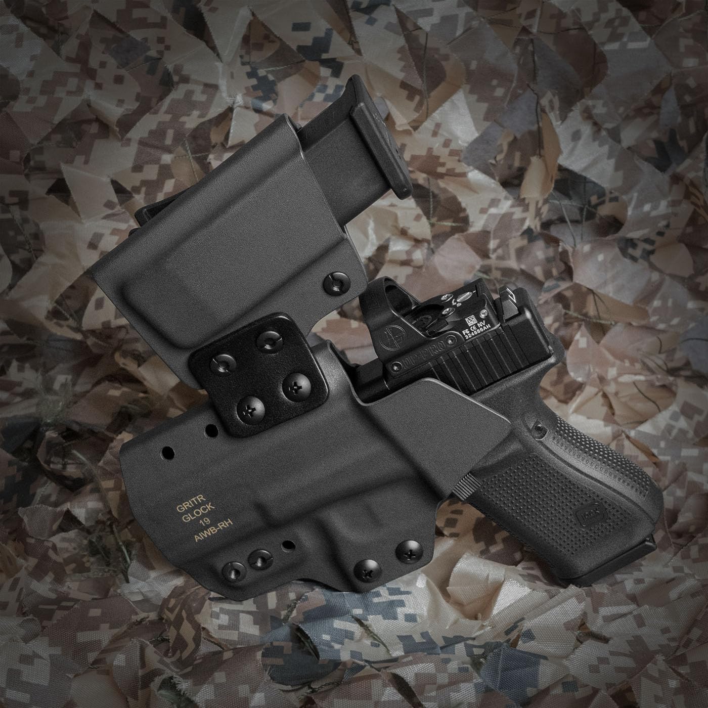 Designed for everyday carriers who value both comfort and functionality, the GRITR IWB Appendix Carry Kydex Gun Holster offers a versatile solution for your concealed carry needs. This belt holster is compatible with Glock 19x/26/34/44 (Gen 3-5), Glock 17/19 (Gen 3-6), Glock 45 (Gen 5, 6) and Glock 21/22/23/31/32/41 (Gen 3-4 only), also compatible with shadow systems MR920/DR920, Lonewolf V1/V2 ltd19; Doesn't fit light/laser-mounted models. Made of durable 0.08" (2mm) Kydex, this sweatproof, wear-resistant, and hand-washable gun holster is built to withstand daily use. An optic cut and open bottom design allow for seamless use with red dot sights, threaded barrels, and compensators â so your setup stays as flexible as you are. The integrated magazine holder keeps an extra mag close at hand without sacrificing concealability. Equipped with a concealment claw, this appendix carry holster pulls the grip of your handgun closer to your body. Multiple adjustable retention points and ride height/cant settings ensure a secure and personalized fit. The modular two-piece design of this Glock 19 concealed carry holster allows you to detach the mag carrier and use it separately if desired. Whether you're an experienced carrier or just starting your EDC journey, this Glock 19 IWB holster offers unmatched comfort and reliability. Backed by the UNLIMITED GRIT Lifetime Warranty, the GRITR pistol accessory is built for the long haul.