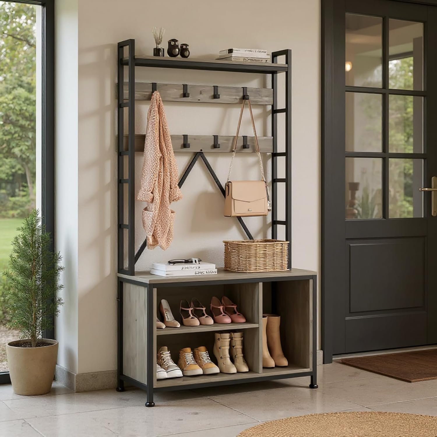 • 5 IN 1 Multi-functional Hall Tree: This hall tree with bench is not just a clothes rack or a shoe bench, but a complete storage and organization powerhouse, with a clothes rack, storage shelf, hanger hooks, shoe bench and a 2-tier shoe cubby, it provides a stylish and efficient solution to meet your different storage and display needs.
