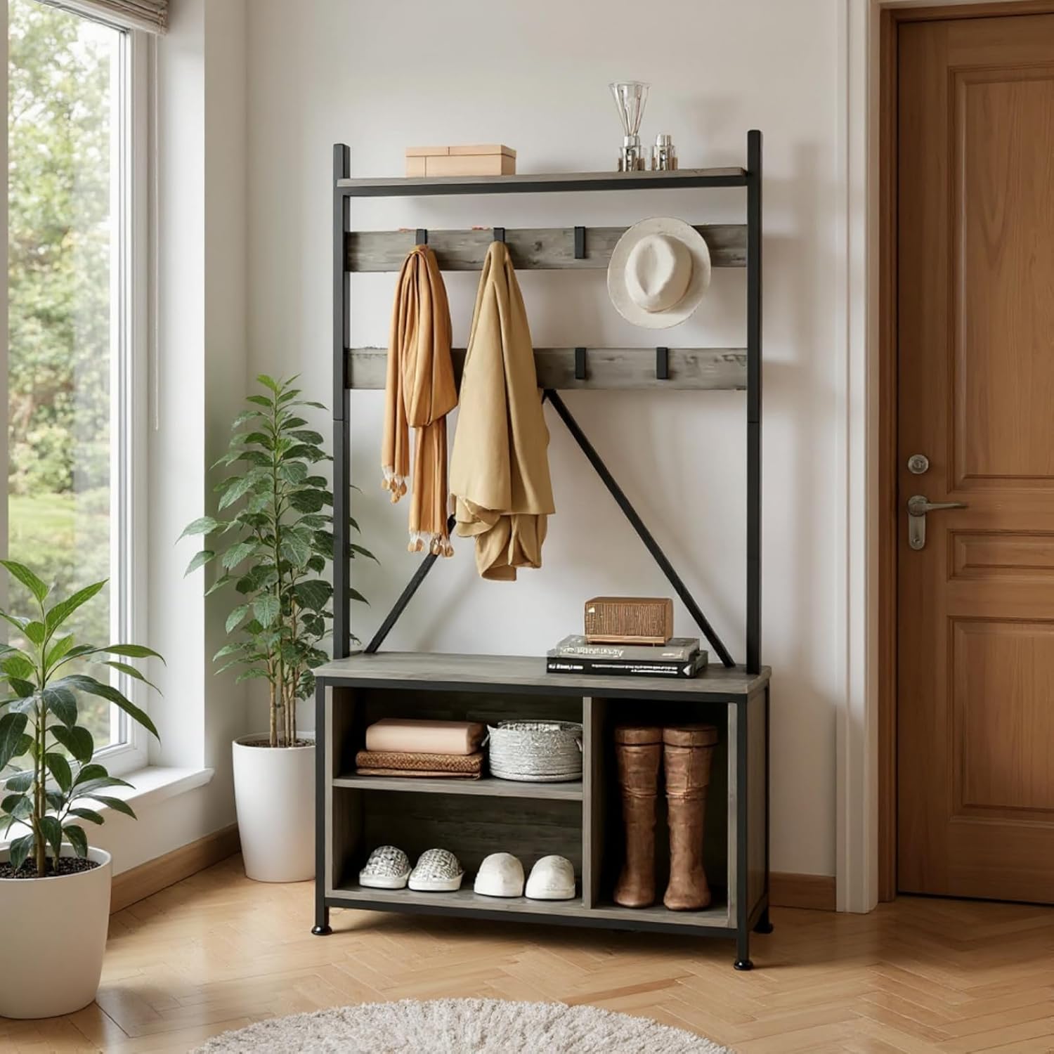 Hall Tree with Bench and Shoe Storage and Coat Rack, Industrial Entryway Bench with Storage Cubbies, Entryway Coat Rack for Hallway, Corner Places, Bedroom