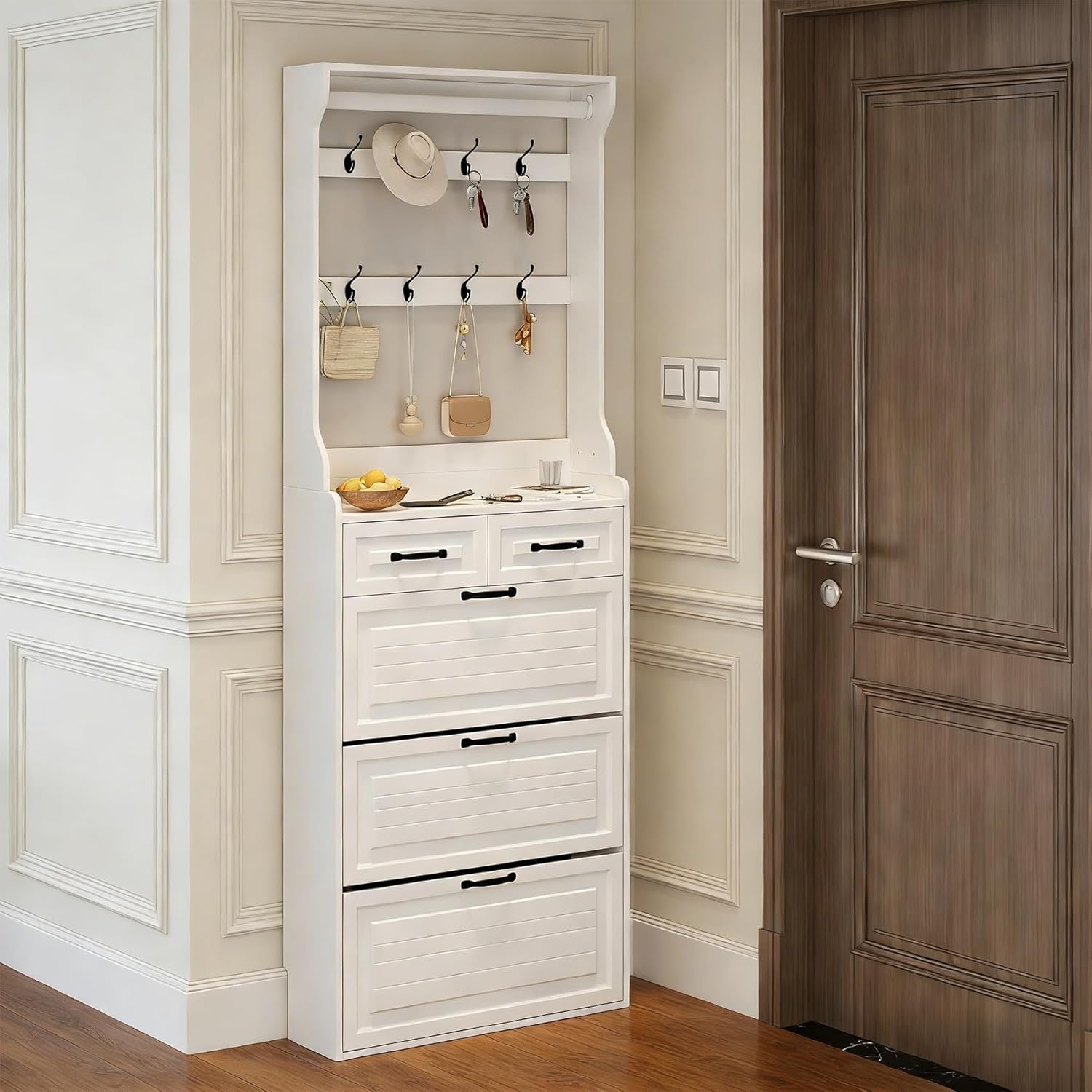 [Strategic Product Insights] Target Audience: This modern hall tree is specifically crafted for homeowners seeking a farmhouse hall tree aesthetic without the bulk, especially those needing efficient mud room storage furniture. Use Scenario: It thrives in high-traffic halls, mudroom zones, and even professional office lobbies as a coat storage cabinet. Problem Solved: Our entryway storage unit addresses the "small footprint, high capacity" dilemma, providing a tree hall farmhouse style that organizes coats, shoes, and mail in one spot. Functionality: The combination of a slim hall tree profile and entryway shelf with hooks creates a multi-functional drop zone. Office Usability: The sleek white hall tree finish makes it an excellent entryway organizer for small businesses, offering a professional coat cabinet for guests and employees alike. How does the overall build quality compare to other mudroom storage options? This mudroom storage cabinet is built using high-density MDF, ensuring it remains sturdy and reliable for daily use. Unlike flimsy shoe cubbies that wobble under weight, our hall tree with storage is a heavy-duty piece of mudroom furniture weighing 95 lbs. The American design ensures it integrates seamlessly into your primary living space while providing more sturdy support than plastic or thin metal entryway coat rack alternatives.Is this halltree stable enough to be freestanding in a house with kids? While it is a freestanding unit, we prioritize safety above all. We include a dedicated anti-toppling wall anchor kit with every entryway hall tree. Once secured, this tall shoe rack becomes an incredibly stable part of your entry way storage, preventing any risk of tipping even when the shoe and coat rack is fully loaded with heavy winter gear and boots.What is the actual capacity of the shoe storage and drawer sections? The three flip-down drawers of this shoe cabinet with coat rack can store approximately 18-24 pairs of shoes, depending on the size. The two additional top drawers are perfect for smaller items like keys and wallets, making this entryway table with shoe storage a complete mud room organization hub. The shoe storage cubbies are adjustable, solving the fit issues often found in a standard narrow hall tree.How difficult is the assembly process for this mudroom cabinet? We provide a highly detailed, illustrated manual where every part of the coat rack with shoe storage is numbered for easy identification. The entryway coat rack with storage components fit together precisely. While it is a tall wall tree for entryway use, the step-by-step video and clear instructions ensure a smooth setup for this mudroom cabinet, typically taking less time than complex halltree for entryway competitors.Product Specifications:Brand: AceinheuAssembled Dimensions: 31.50" L x 9.25" W x 86.62" HMaterial: High-Grade MDF in White Hall Tree FinishStorage Components: 3 Flip Drawers, 2 Accessory Drawers, 7 Entryway Hooks, 1 Shelf with HooksDesign Style: American Traditional, Art Deco, Traditional Hall TreeTotal Weight: 95.00 lbsApplicable Scenes: Entryway, Mud Room, Hallway, Cloakroom