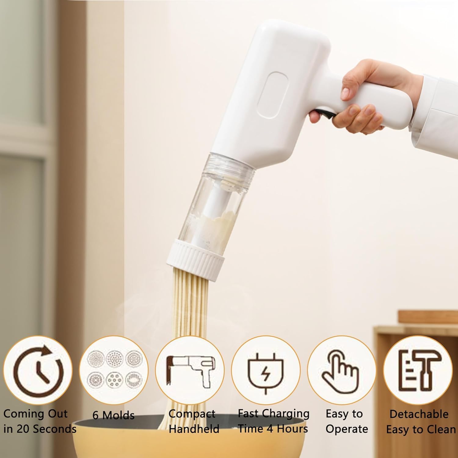 "Specification: 🍜 Material: ABS Battery Type: Lithium Battery (Built in) Input voltage/current: 5v/2A Rated capacity: 200g dough lithium battery capacity: 1800mAh Size: 300*205*58mmPackage Includes: 1*Electric pasta maker 6* Pasta MoldsSimple Steps to Make Pasta 1. Choose a pasta mold to put in the lid and put 200g of dough into the loading tube. 2. Fasten the loading tube to the machine 3. Switch to the button ""I"", then you can get the noodles out quickly 4. Switch to button ""II"" to retract the push plate, button ""0"" means the machine is off.PS: - Coating the inside of the loading tube with a layer of cooking oil before putting in the dough will help prevent the dough from sticking to the loading tube. - Suggested ratio of dough to water is 2:1. - Press directly into the boiling water to prevent the noodles from sticking.6 Types of Pasta Molds The 6 molds include spaghetti, macaroni, linguine and more. Push Rod It can produce noodles quickly in 20 seconds, and the operation process is silky smooth and unhindered. Visual Screw Loading Drums The loading bucket is made of visual material so that the remaining dough can be observed at all times. Switchv Switch to button "I"to press the pasta directly into the boiling pot, button ""II"" to retract the push rod and button "0" for off.