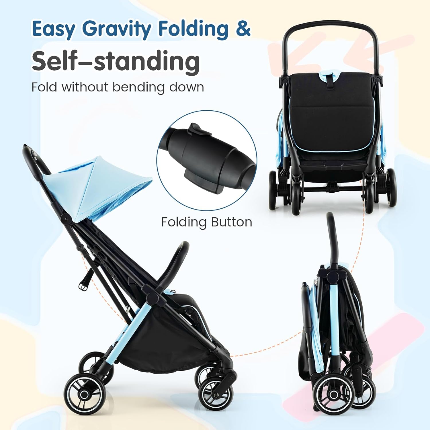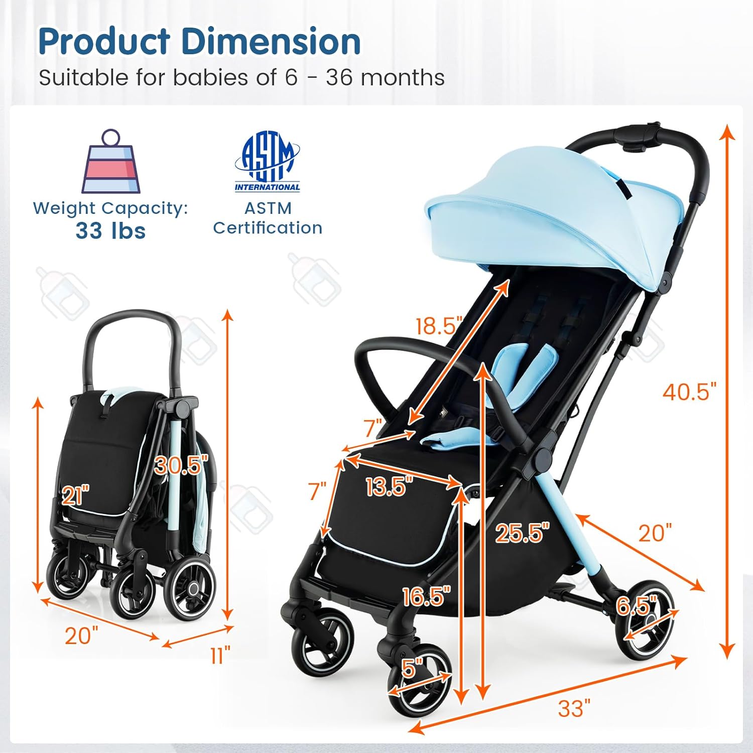 Description:Explore the outside world with your little one by using our lightweight baby stroller!If you and your baby need to travel by air, just take our compact travel stroller because its folding dimension matches the airplane overhead bin. When you arrive at the desired place, this stroller can be simply opened with one-hand without bending down for great convenience. To make your your baby more comfortable, just adjust the canopy, backrest and footrest for him/her. And the universal wheels make this stroller go through different roads steadily, allowing your baby to feel sound all the way through. Hey, your taxi is here! Just press and push the fold button and the stroller will fold itself in seconds, making you always happy.Note: Please take off the handle bar for tighter situations.Features:Make the stroller super easy to use with gravity folding designFolding it without bending down for waist protectionThe folded stroller can stand-alone to better take care of your babyLightweight aluminum frame and handy handle for easy carryingFit in an airplane overhead bin with compact folding dimensionPlease take off the handle bar for tighter situationsEasy to zig-zag with flexible universal wheelsShock-absorbing design for the better travel experienceKeep the stroller in place with a one-step brakeAdjustable canopy, backrest and footrest for different needsBreathable and soft Lycra fabric for a cozy lying experienceCheck your baby condition’s in real-time through a peek-a-boo windowSafe to use with the 5-point safety harness and ASTM certification Capable of storing the needed items on the bottom basketSpecifications:Color: Black/Gray/Blue/PinkMaterial: Aluminum, Polyester, Lycra Fabric, Oxford Fabric, EVAOverall Dimension of Unfolding: 33” x 20” x 40.5” (L x W x H)Overall Dimension of Folding (with Handle): 11” x 20” x 30.5” (L x W x H)Overall Dimension of Folding (without Handle): 11” x 20” x 21” (L x W x H)Net Weight: 15 lbsWeight Capacity: 33 lbsRecommended Age: 6 - 36 MonthsPackage Includes:1 x Stroller1 x Instruction Manual