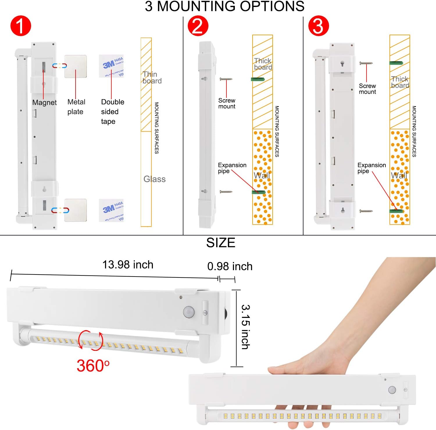 | Mounting Type | Magnet ,3M double sided tape or Screw |