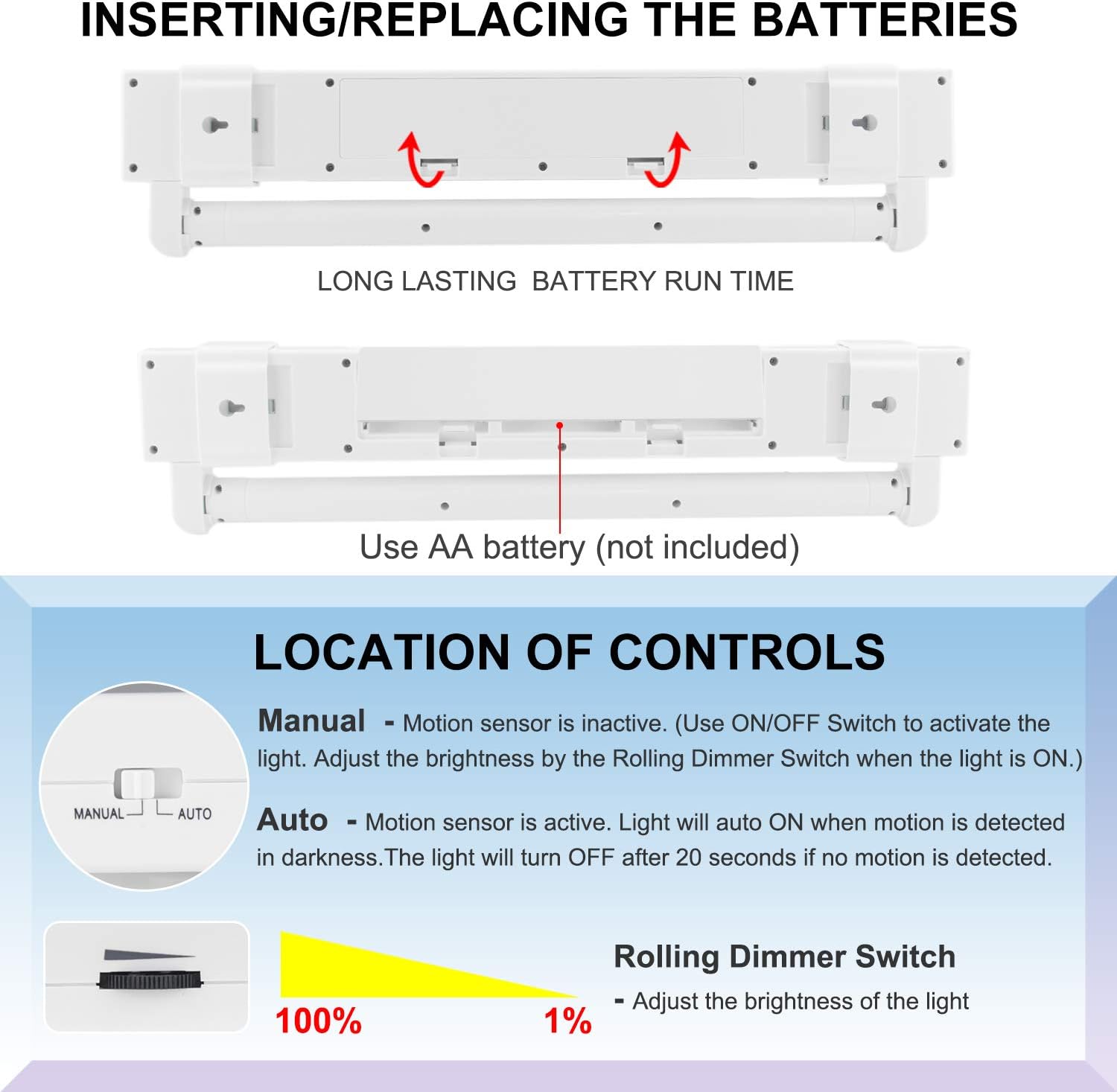 More Details* 46 SMD LEDs ,250 Lumens,3000K warm white light,2.16W, DC 9V, lifespan is 30,000 Hours.* Powered by AA batteries (not included).If use as normal warm light,the battery run time is about 55 hours. If use as motion sensor light, the battery run time is about 350 days based on 8 times/day ,20S/time. * 2 ways operate:Manual ON/OFF and Motion-Activated ON/OFF.*Easy to install with built-in magnets or double-sided tapes or screws(all included).Can screw mounting with or without mounting bracket.InstallationScrew Mounting with Mounting Bracket:(1)Drill 2 pilot holes in the location where you want to mount the light.(2)Place screws through the mounting brackets and in pre-drilled holes.Make sure the 2 mounting brackets are level&with two keyhole slots in the same direction before securing them to the wall.Tighten the screws to secure the mounting brackets.Do not overtighten.(3)Put the light back into the mounting brackets by pulling the lower end of mounting bracket down.(4)To move the light from the 2 mounting brackets,simply pull the two ends of mounting brackets.Screw Mounting without Mounting Bracket:(1)Drill 2 pilot holes in the location where you want to mount the light.(2)Place screws in pre-drilled holes &tighten the screws but do not overtighten.(3)Place screws in pre-drilled holes.Tighten slightly until secure, but do not tighten all the way. Align and slide the keyhole slots on the side of the light over screw heads.Slide the unit down.Packing List- 1 x LED Motion sensor light bar- 2 x Magnets- 2 x Double sided tapes- 4 x Screws- 1 x User manual