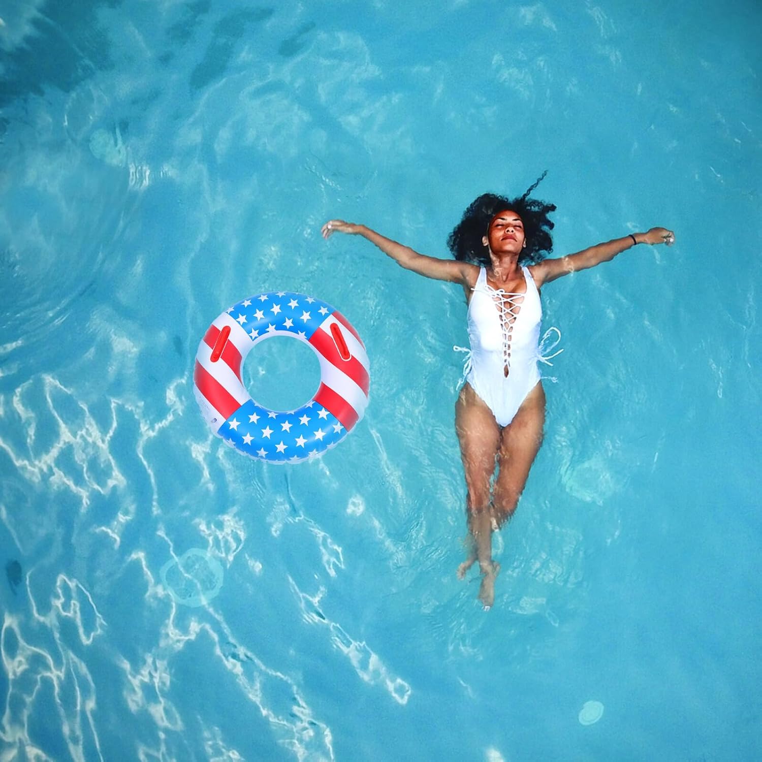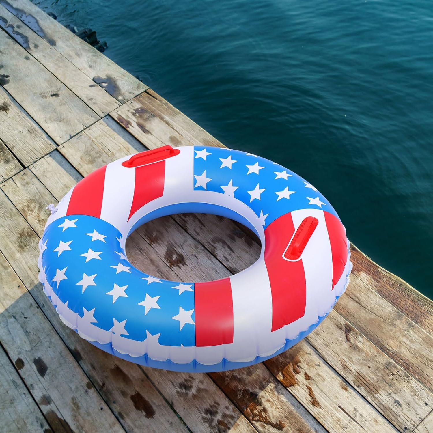 Package List 1 x swimming ring Characteristics - Color: As shown (random color for grips). - Size: 75.00X75.00X0.30cm/29.48X29.48X0.12inch. - Material: PVC. -Product Info:Lifebuoy - This is a suitable for water activities, such as pool parties, beaches, etc inflatable rings. - Manufactured with premium PVC material, durable and practical enough to use. - Excellent at the internal seam, don't have to worry about water leakage at all pvc swimming ring. - Easy to inflate, it is an essential tool to assure safety when playing in a pool inflatable rings for adults. - The star flag pattern swimming ring will bring more Independence Day atmosphere to your party! Swimming RingGoods Informationpvc floats Made of environmentally friendly PVC material, the surface is smooth, elastic, aging resistant, thicker and softer and durable.swimming pool floats This is specially designed so that it can float smoothly on the water surface and allows you to inflate the inflatable pool float more quickly and easily