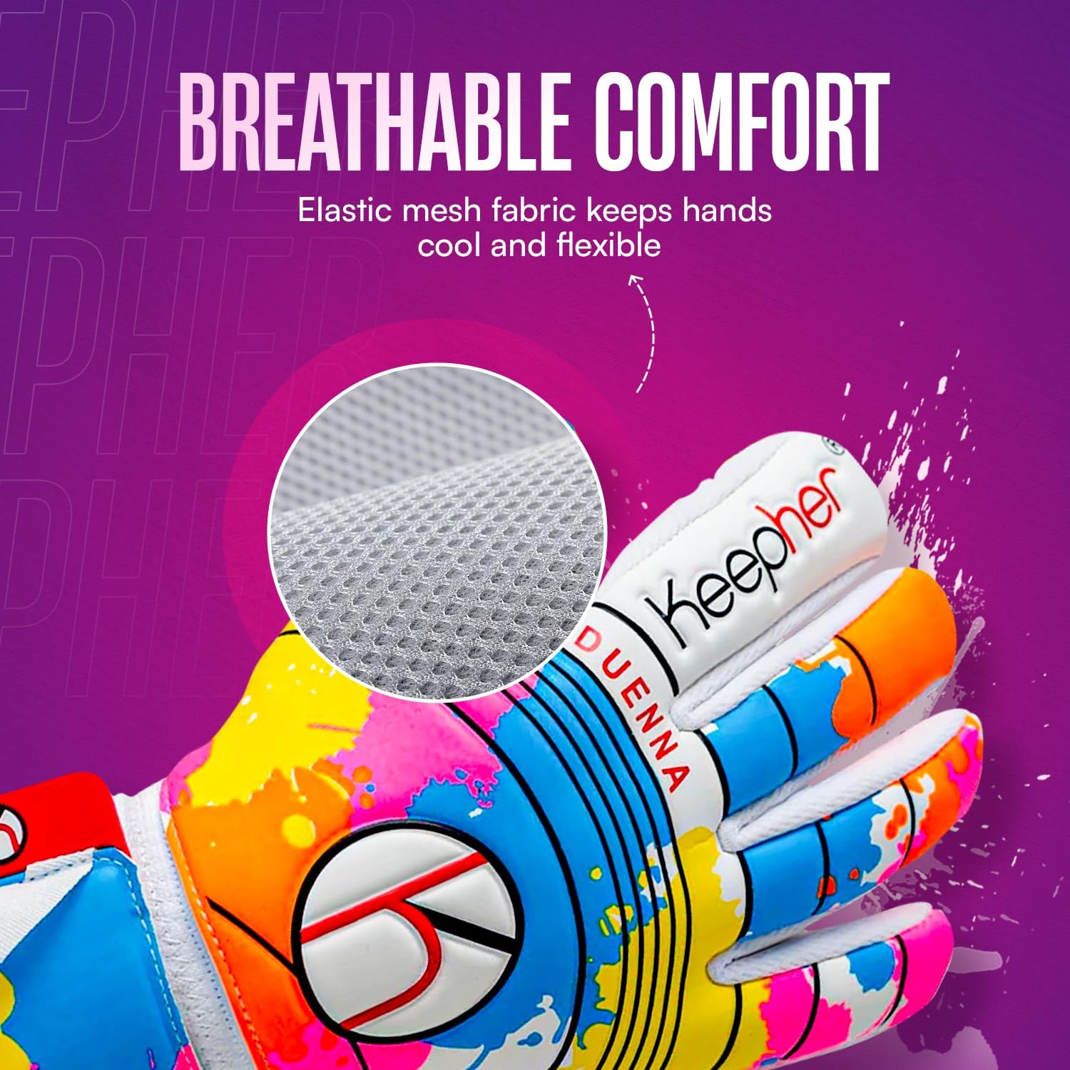 Welcome to Keepher, a USA-based brand focused on empowering female goalkeepers with high-quality goalie gloves women that deliver unmatched performance, protection, and confidence on the field.Meet the Keepher Duenna Match Elite Girls Soccer Goalie Gloves, designed specifically for female goalkeepers. With advanced grip, protection, and comfort features, these gloves offer superior fit and control, empowering you to handle every shot with confidence.Ultimate Grip and Control: The 3.5mm Giga Grip Latex palm ensures superb shot absorption, handling, and ball control in all weather conditions. Suitable for goalie gloves women and goalie gloves size 6.Double Wrist Safeguard System: An adjustable double wrist safeguard provides powerful support against injuries, while the reinforced Finger Save System prevents hyperextension with extra cushioning. Ideal for goalkeeper gloves kids 9-12.Breathable and Comfortable Fit: The breathable elastic mesh fabric enhances hand flexibility, keeping your hands cool. Our all neoprene design provides a secure fit for goalie gloves youth.Durable and Lightweight: Crafted with high-quality EVA, latex, and PU materials, these lightweight yet durable gloves are built for long-lasting performance.Perfectly Designed for Female Goalkeepers: Ergonomic and specifically crafted to meet the unique needs of female goalkeepers, including girls soccer goalie gloves and girls goalie gloves.