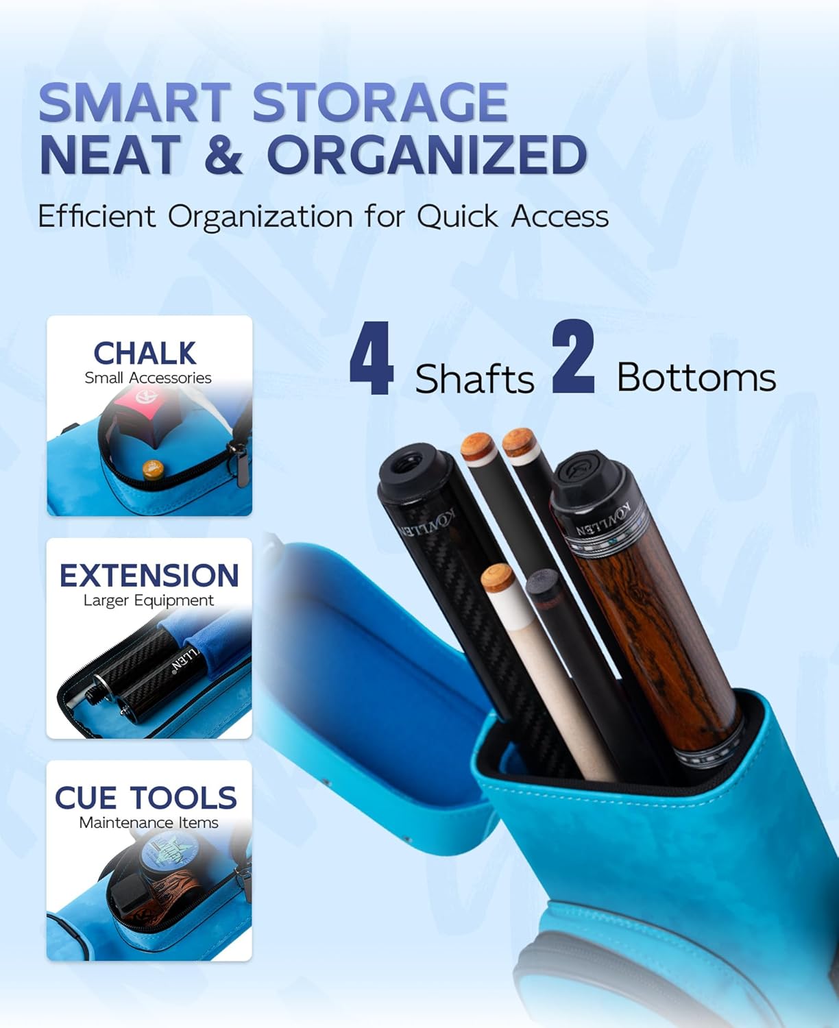 Protect your cues with the KONLLEN 4x2 hard pool cue case, designed to hold up to 4 shafts and 2 butts. The structured exterior helps maintain its shape better than soft cue bags, while the padded interior keeps cue parts organized and better protected during storage and travel. Multiple accessory pockets store chalk, gloves, tips, and tools. Finished with PU leather, detailed stitching, zinc alloy hardware, a carry handle, and an adjustable shoulder strap for league nights, tournaments, and everyday use.