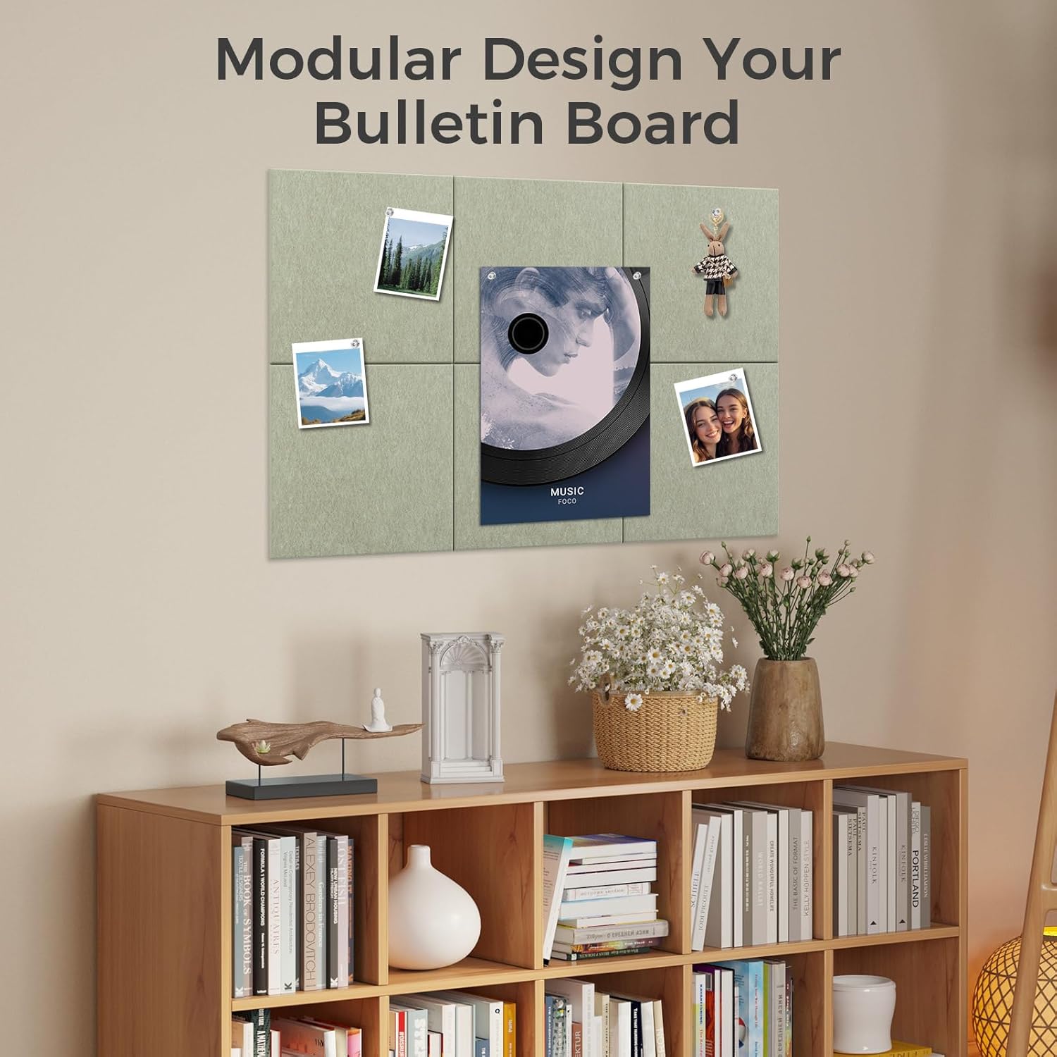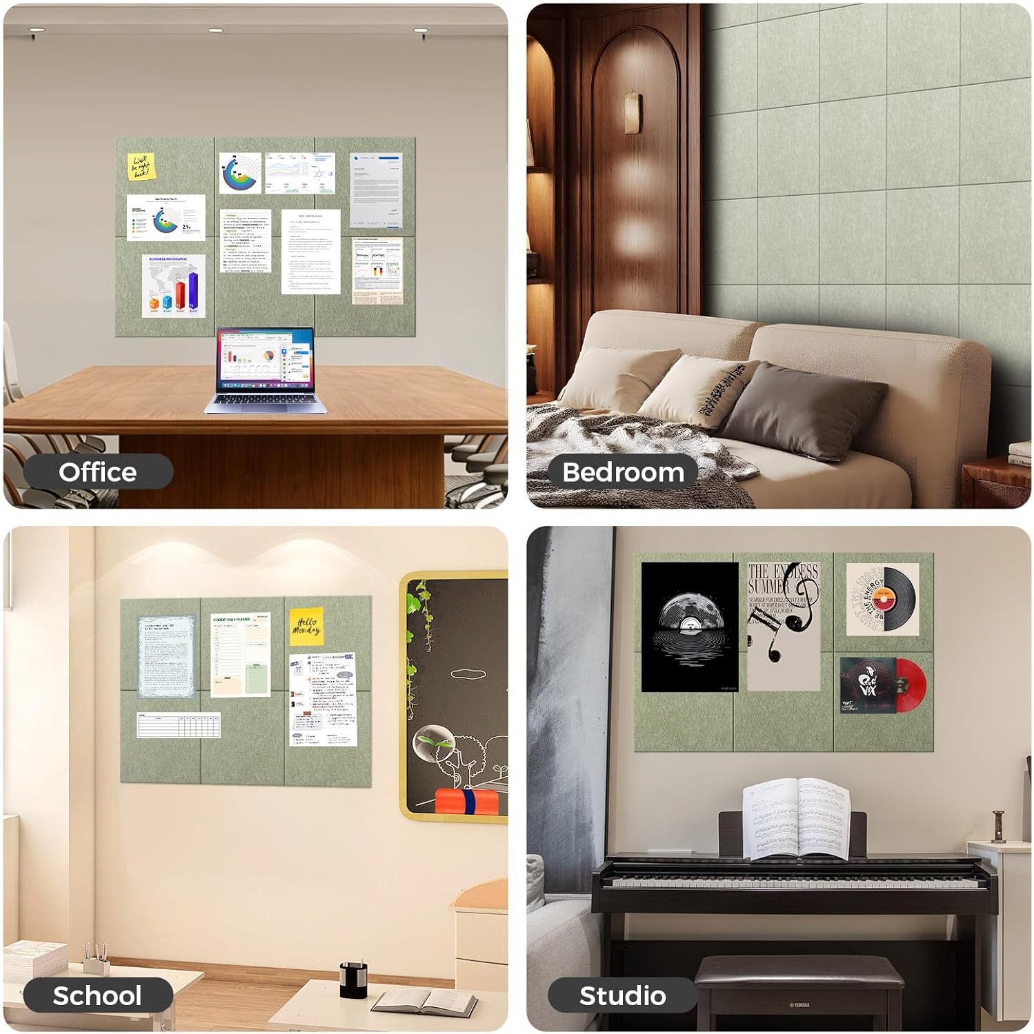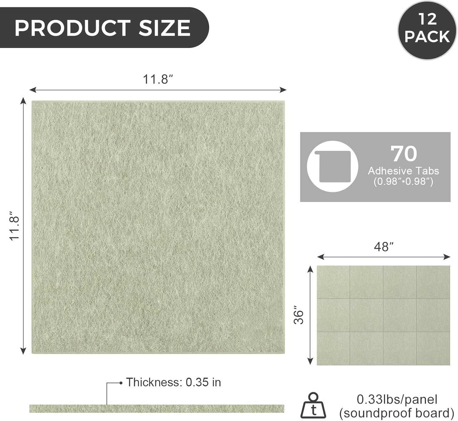 PRODUCT PARAMETERS: · Product Name: Felt Bulletin Board Tiles · Product Weight: 0.33lbs/panel · One Piece Product Size:11.8*11.8*0.35 inches · 12 Pack Product Size:48*36inches · Product Material: 100% Polyster Fiber PACKAGING ACCESSORIES: · 12 x Acoustic Panel · 70 Adhesive Tabs