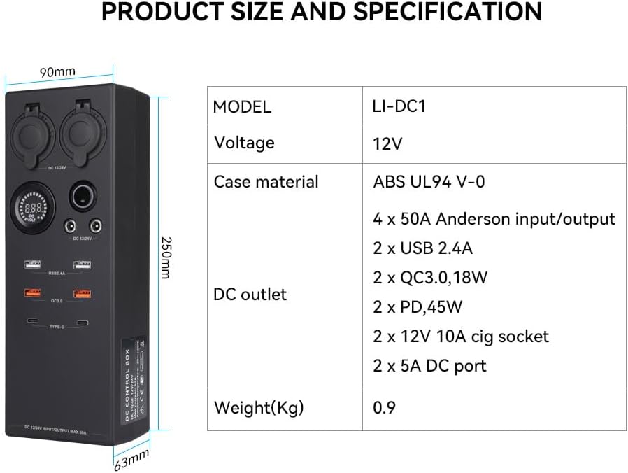 Transform Your Battery into a Professional Power Station!The LICITTI DC Control Box is the ultimate power distribution solution for outdoor enthusiasts, RV owners, and off-grid professionals. With its high-current 50A Anderson inputs/outputs and 13 versatile ports, this compact hub turns any 12V/24V battery into a robust charging station – perfect for drones, laptops, refrigerators, cameras, and more.Why Choose Our DC Power Box?✅ Military-Grade Connectivity: 4×50A Anderson ports handle heavy-duty equipment, while 6×USB (including QC3.0 and 45W PD Type-C) fast-charge phones/tablets.✅ Intelligent Power Management: Color voltmeter monitors battery health in real-time. Blade fuses auto-cut power during overloads (over 50A/600W).✅ All-Terrain Ready: Mount the slide-back plate in vehicles or use portably with extension cables. ABS casing resists impacts and dust.Technical ExcellenceInput/Output: DC 12V/24V (10-30V range)Max Current: 50A per Anderson port (fuse-protected)USB Outputs: 2×USB 2.4A (12W) + 2×QC3.0 (18W) + 2×PD Type-C (45W)Dimensions: 9.8×3.5×2.5 inches | Weight: 2 lbs⚠️ Critical Safety NotesDO NOT expose to water or operate above 600W/50A.For dry environments only. Keep away from children.Replace fuses ONLY with 50A blades (back panel accessible).Package Includes:1× LICITTI DC Control Box (Model LI-DC1), User ManualApplications: Camping | RV Power | Marine Use | Drone Operations | Emergency Power | Field Work
