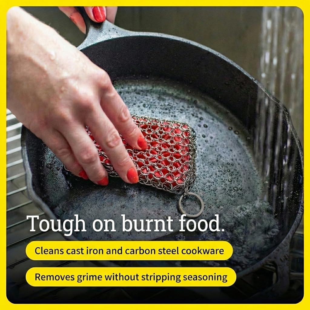 Durable stainless steel chainmail rings create a textured surface that is ideal for heavy-duty cleaning, is dishwasher safe, requires minimal storage space, and will last a lifetime. No soap or cleaners necessary, simply add warm water to your cast iron pan and scrub. The silicone core compresses to prevent scratching and helps alleviate pressure if you scrub too hard, thus preventing damage to the surface of your cast iron cookware.