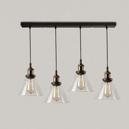 SpecificationsLight Information : Category: Multi-Light PendantsUsage: Indoor LightingShade Shape: Cone Dimensions : Fixture Height: 3.94 inch (10 cm)Fixture Width: 7.87 inch (20 cm)Chain/cord Length: 39.37 inch (100 cm)Chain/Cord AdjustableBase Width: 35.43 inch (90 cm)Bulb Information : Bulb Type: LED/CFL/IncandescentBulb Base: /Bulb Not IncludedNumber Of Lights: 5Wattage Per Bulb: Max 40WMaterial : Shade Material: GlassOthers : Shade Color: ClearGlass Treatment: RibbedShipping Weight: 5.5KG
