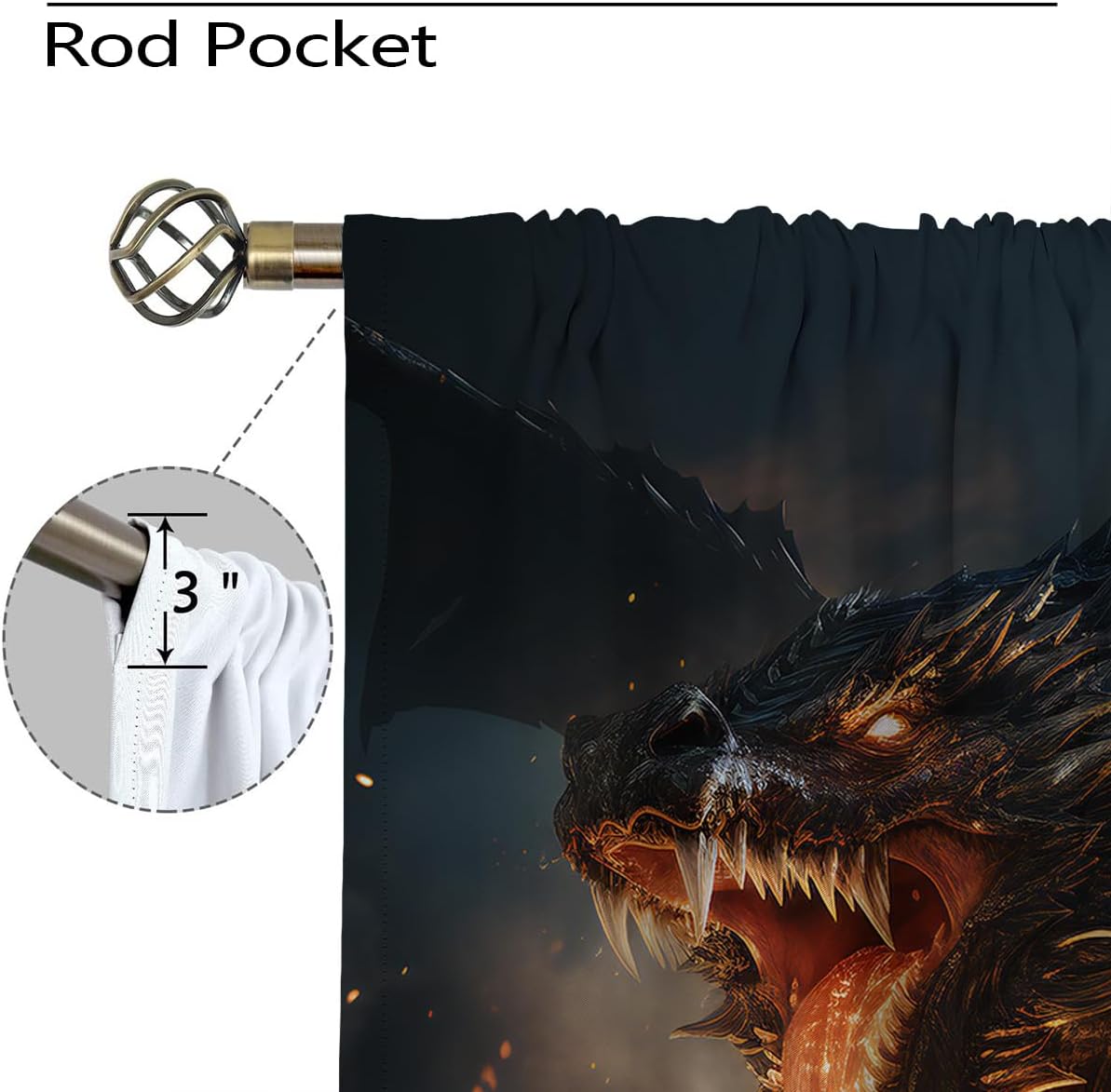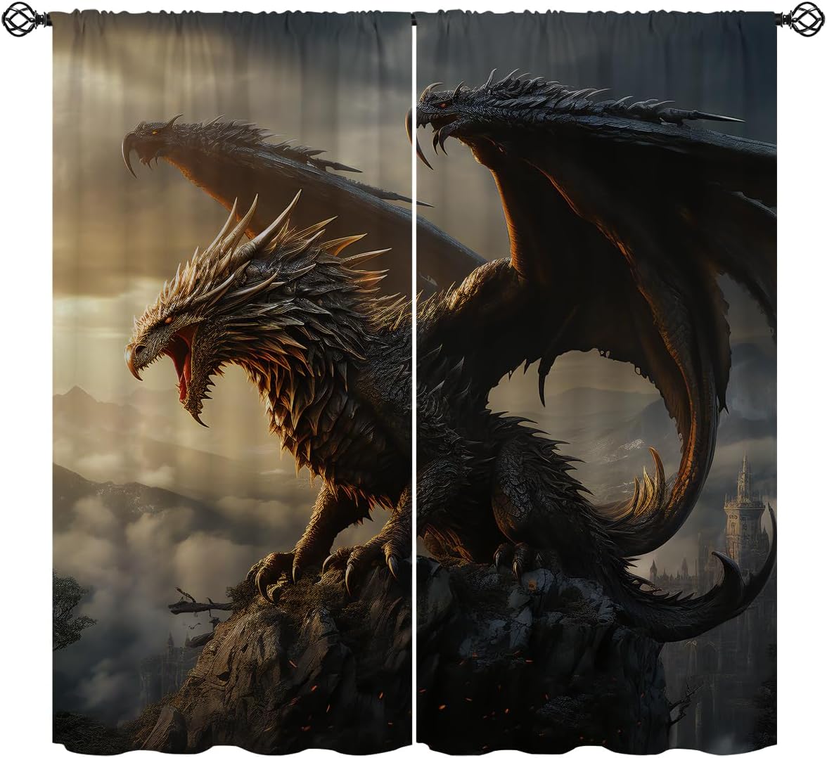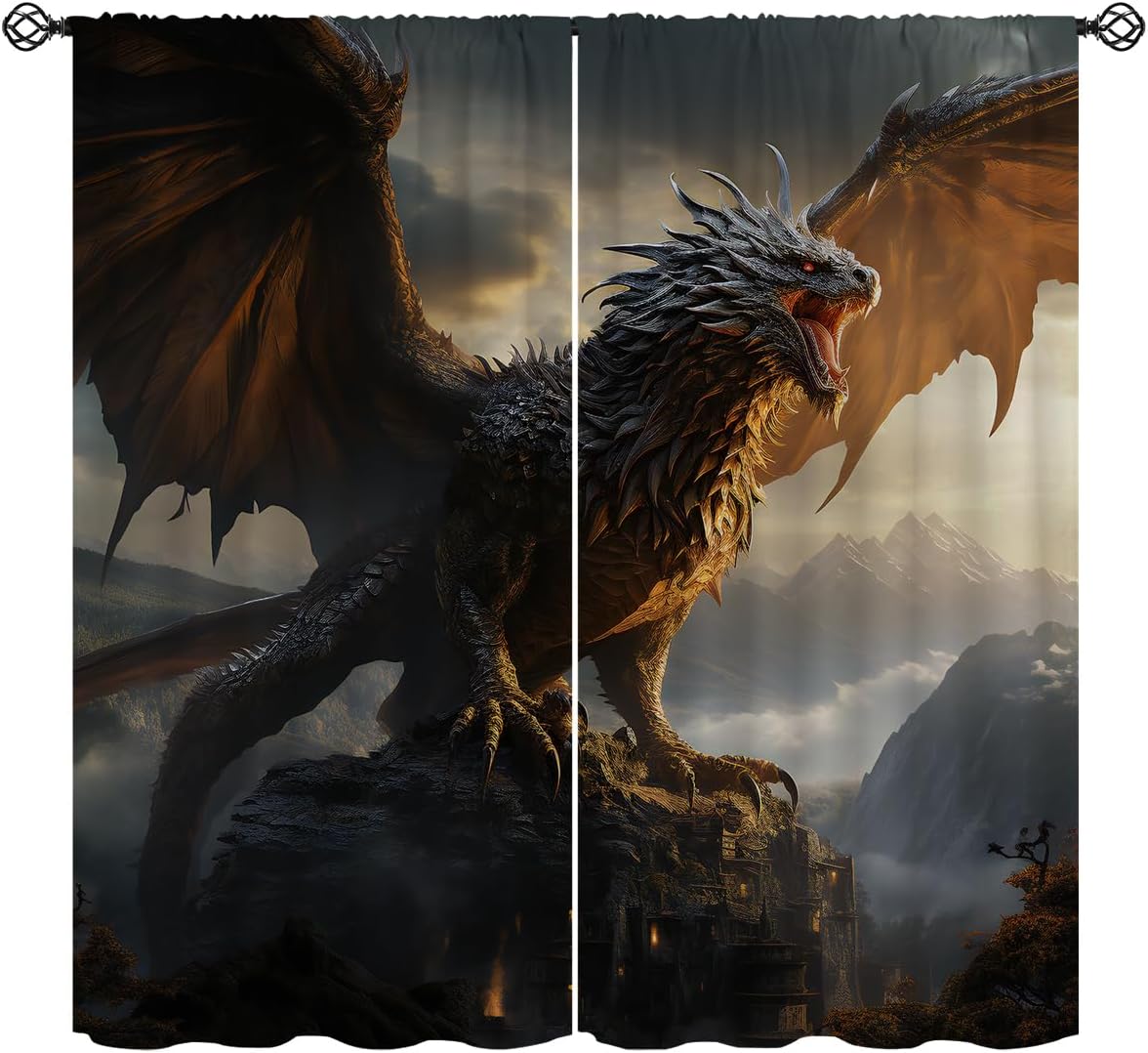 These print curtains are perfect for Living room, bedroom, kids room, kitchen, yard, patio, parlor, sliding door with Magic Dragon,Mythical Fantasy Animals Scary Fire Dragon pattern.- Unique design:· Save energy costs by insulating against heat and cold.· Reduce noises from busy streets and high-traffic areas.· Protect furniture from sun damage and fading.· Provides complete privacy when needed· Perfect for any bedroom, office kids room and living room.- Package Included:· Blackout window curtains 2 Pcs set ( two panels).- Material:· Our Blackout Curtain Liners are crafted from a durable soft and thick triple weaved blackout fabric which can block out sunlight and UV rays. The darker color of the fabric, the more light it can block.- Easy Care Instructions:· Machine washable in cold water· Do not bleach.· tumble dry on low· low temperature ironing.- Notes:· For your curtains to be more perfect, please choose a size 5-10 Inch larger than the actual window width.· here may be slight differences in colors on different displays. If you have any questions about the product, please feel free to contact us.