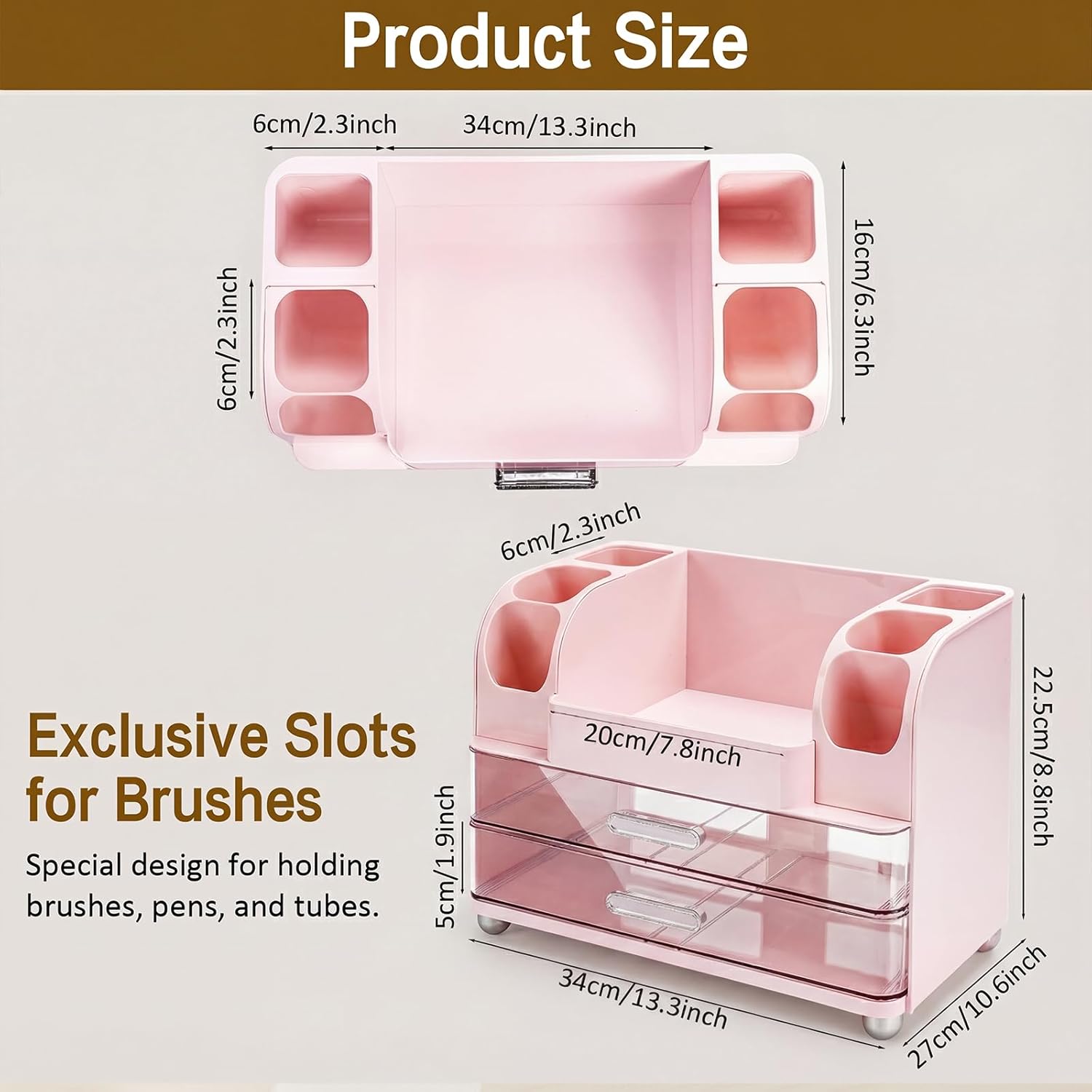 Organize and elevate your beauty routine with this multi-compartment makeup organizer, designed for both style and function. Featuring a double-drawer layout and partitioned top section, it offers intuitive storage for all your skincare, cosmetics, and brush essentials. Key Features & Benefits Ample Storage Space – Two generous pull-out drawers provide ample room for larger items, while the top tray keeps brushes and daily use bottles easily accessible. -Comes with brush holder - Six brush holders can maintain the shape of the brush, prevent cosmetics from accumulating, and facilitate cleaning. Durable & Easy to Maintain – Made from thick ABS plastic that resists staining and wiping down is a breeze. Stylish & Functional – Sleek vanity design enhances your counter with a clean, minimalist look while keeping clutter under control. Versatile Use – Ideal for makeup, skincare, jewelry, or accessories; fits on vanities, countertops, or dressers. Use & Care Instructions Clean with a soft damp cloth; avoid harsh chemicals. Detachable brush holders can be rinsed separately. Avoid excessive drop impact to maintain drawer alignment.