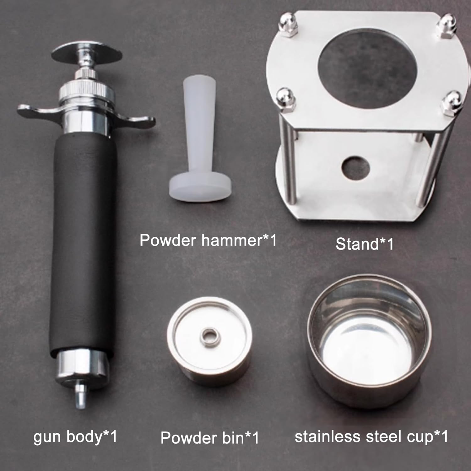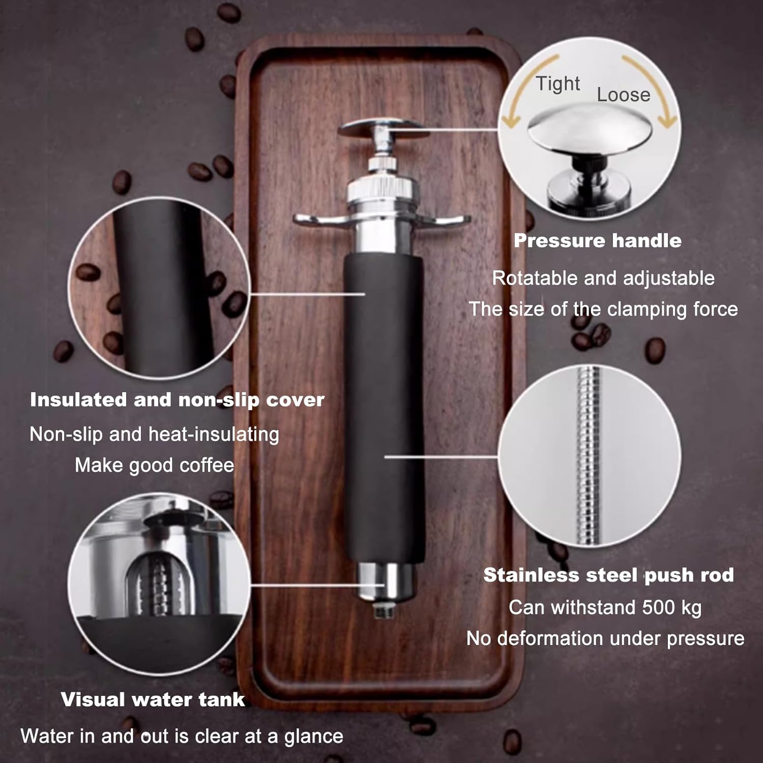Welcome! Wish you a happy shopping~ Product specifications: Name: Hand-pressed coffee machine Powder bowl: 14g Water tank: 100ml Stainless steel push rod: can withstand 500kg pressure without deformation Water tank: visual water tank Pressure handle: can rotate to adjust pressure Storage bag size: 230x210x90mm Packing list: Gun body*1 Powder hammer*1 Powder bin*1 Stand*1 Double-layer stainless steel cup*1