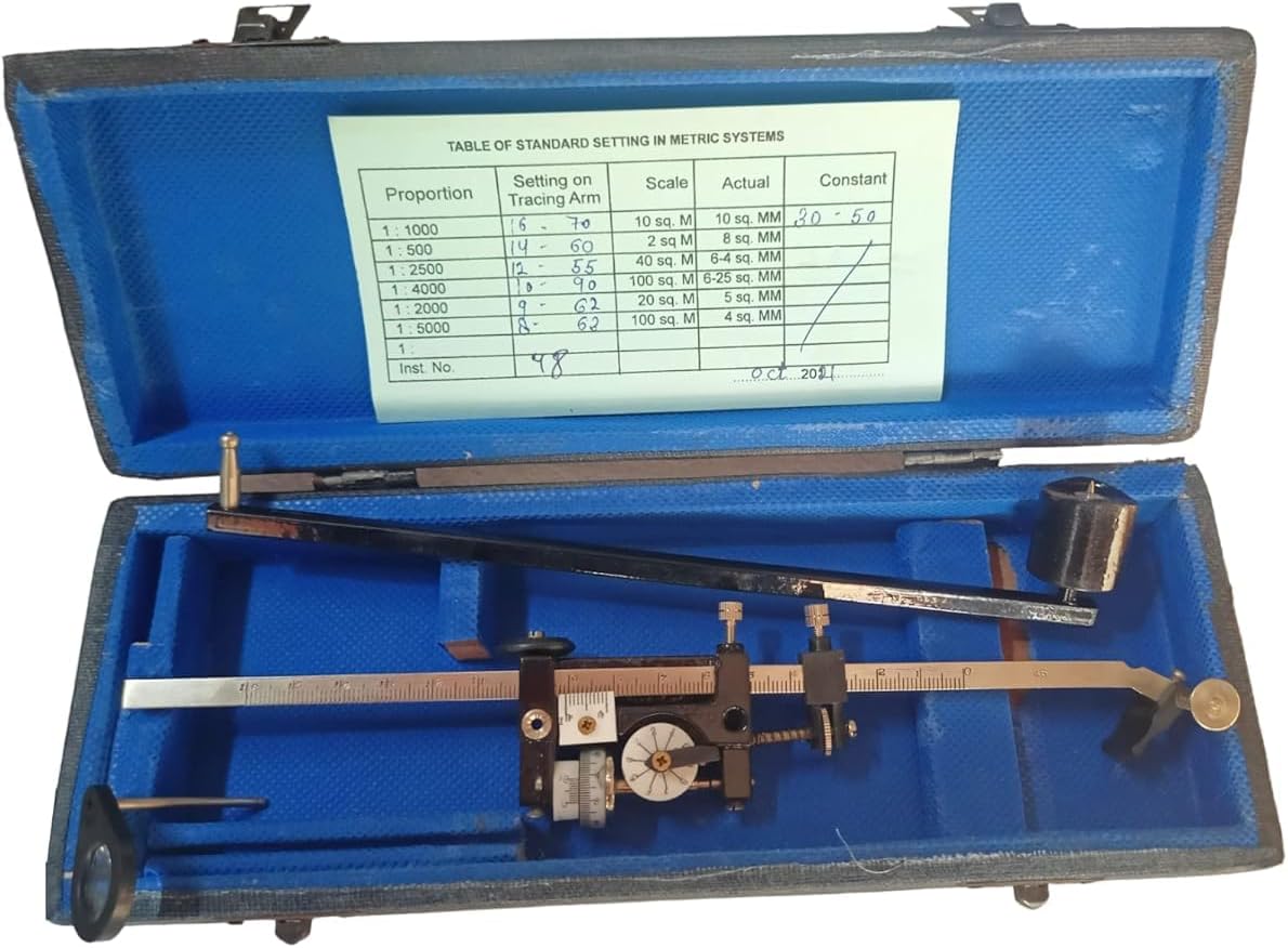 โจ Key Features & Specifications Precision Engineering: Features a high-quality tracing arm and a finely graduated measuring wheel with a vernier scale for repeatable accuracy. Integrated Metric Reference: Includes a "Table of Standard Setting in Metric Systems" conveniently mounted inside the case, covering proportions from 1:1000 to 1:5000. Versatile Scaling: Supports multiple proportions and constants, ensuring the tool is adaptable to various map scales and engineering requirements. Professional Durability: Constructed with a weighted base and precision-machined metal components for stability during use on large-format drawings. Protective Storage: Ships in a custom-fitted, foam-lined hard case to maintain calibration and protect the mechanical assembly during field or office transport. ๐ Application & Use Ideal for calculating land area from topographic maps, determining site dimensions on architectural blueprints, and assisting in site reconnaissance for civil engineering projects. It is an essential tool for both professional surveyors and engineering students.