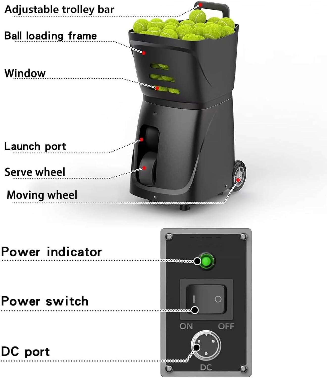 Product specifications:- Large-capacity ball rack, can easily hold 100 balls, easy to store- One-button high-pressure ball, one-button operation via mobile phone Bluetooth, simple and easy to operate- Portable and compact remote control, can be put in your pocket, can be operated to start or pause at any timeProduct name: Tennis serving machineAC power supply: 110V/220VPower: 60WDC power supply: 24VBall capacity: 100Serving frequency: 1.8 s-8.8 sProduct size: 43.5*32*66 CMPackaging size: 43*37.5*48.5 CMPackage includes:Host*1Remote control*1