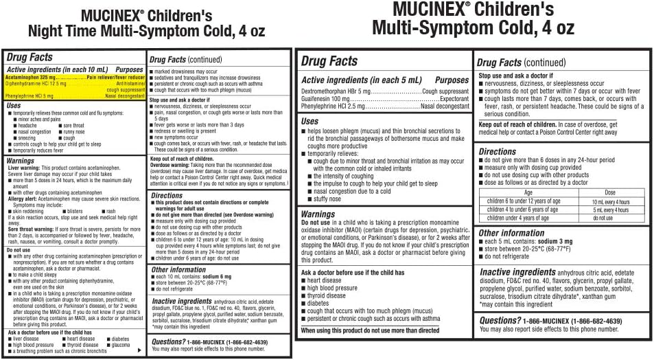 Mucinex Children's Day & Night time Multi-Symptom Cold Medicine includes a day time and night time relief solution for children. Day Time Multi-Symptom Cold includes a cough suppressant (Dextromethorphan HBr 5mg), Expectorant (Guaifenesin 100mg), and a Nasal Decongestant (Phenylephrine HCl 2.5mg) for relief of common symptoms such as Stuffy Nose, Cough, Chest Congestion, and Mucus. Night Time Multi-Symptom Cold relief includes active ingredient Acetaminophen which acts as a pain reliever and fever reducer, Diphenhydramine HCl 12.5mg acts as an Antihistamine Cough Suppressant, and Phenylephrine HCl 5mg helps with Nasal Decongestion. This helps relieve symptoms such as Stuffy Nose, Cough, Runny Nose and Sneezing, and Fever & Sore Throats.