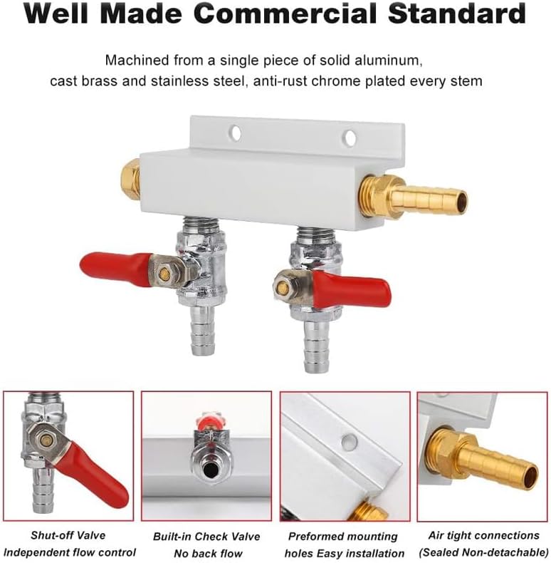 This multi-way CO2 Gas Distribution Manifold Splitter is designed for home brewing and draft beer dispensing, available in 2/3/4 way configurations with 5/16 inch barbs and 9mm fittings.Features:- Machined from a single piece of aluminum for sturdy, long-term use- 5/16 inch barbs on outlet valves, suitable for professional draft installations- Built-in mounting plate for straightforward and secure setup- Chrome plated valves paired with spring-loaded check valves to help prevent backflow- Durable metal construction to support reliable performance in home brew setupsThis gas manifold helps distribute CO2 to multiple lines, making it a practical choice for kegerator and homebrew systems.Package includes:- 1 x CO2 Gas Manifold DistributorProduct type: Gas Line Manifold SplitterMaterial: MetalOrigin: Mainland China