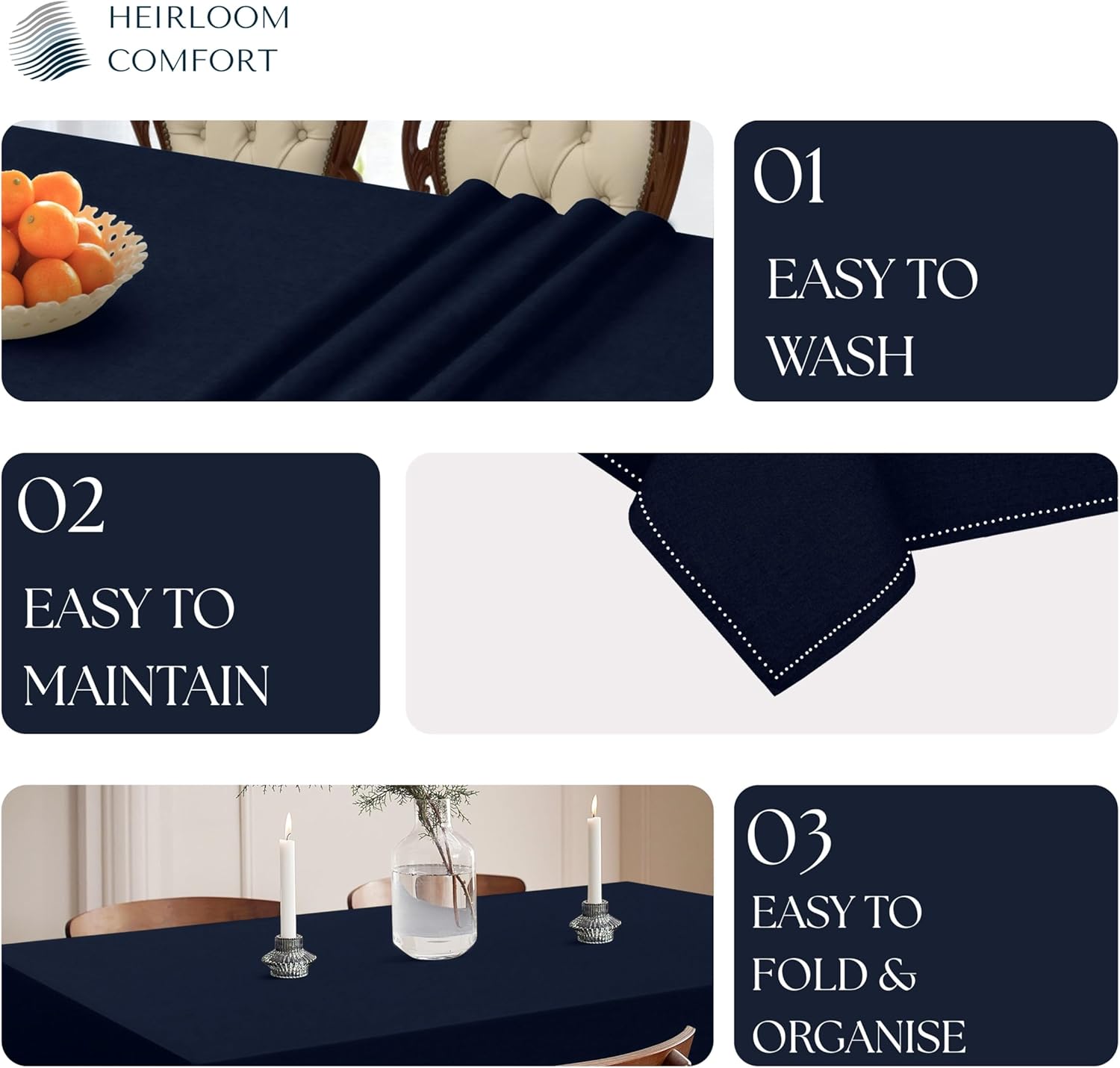 Enhance your dining experience with our HEIRLOOM COMFORT 100% Cotton Tablecloth, available in versatile sizes of 52x70, 60x84, and 60x102 inches to fit tables seating 4-6, 6-8, or 8-10 guests. Crafted from premium cotton, our tablecloth offers a soft, luxurious texture while ensuring durability and long-lasting use. Its wrinkle-resistant and washable design makes maintenance effortless, allowing you to focus on hosting memorable gatherings. The classic rectangular shape complements both formal occasions and casual family meals, adding a touch of elegance to any table setting. Ideal for weddings, birthdays, holiday feasts, and everyday use, HEIRLOOM COMFORT tablecloths seamlessly blend practicality with timeless charm. Choose from a variety of colors to match your decor, and enjoy a dining space that exudes warmth and sophistication. Made from 100% natural cotton, our tablecloth is free from synthetic fibers, making it sustainable choice for your home. Its sturdy weave ensures excellent coverage and protects your table from scratches and spills while offering a polished, refined look. Whether you're planning a festive holiday dinner, a rustic farmhouse brunch, or an elegant wedding reception, our tablecloth serves as the perfect backdrop for all your cherished moments. The easy-care fabric is machine washable, maintaining its vibrant color and smooth finish wash after wash. Experience effortless elegance, lasting quality, and a touch of luxury every time you gather around your table.