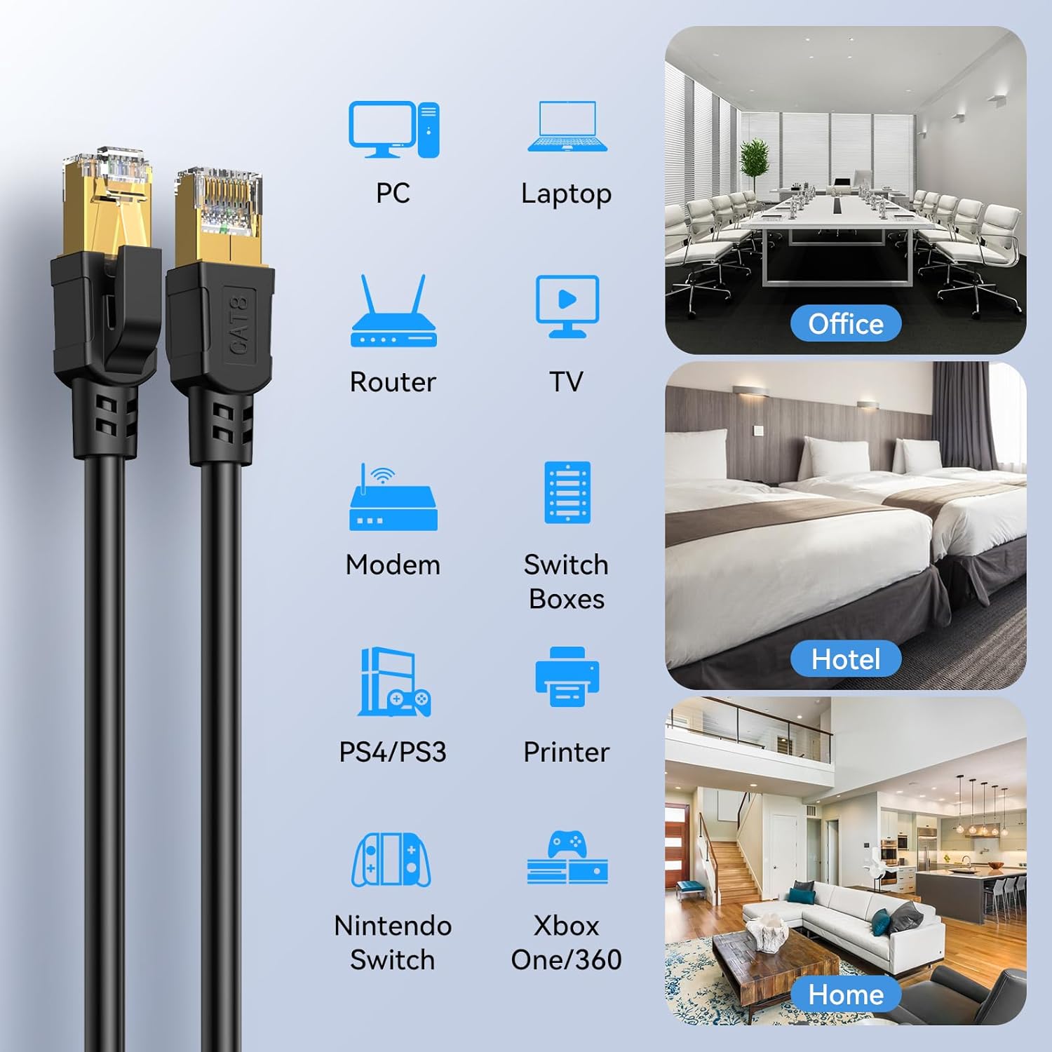 onnectors & Wide Compatibility:With two shielded RJ45 connectors at both ends, the Cat8 Ethernet cable works perfectly Compatible with all the previous(cat5, cat5e, cat6, cat6a and cat7), And computers, laptops, modems, routers, PS5/4/3, X-Box 360, X-Box One, Switch, networking switches, ADSL, network adapters, hubs, Networking Printers, Smart TV, IP Cam, Imac, and other devices with RJ45 connectors.