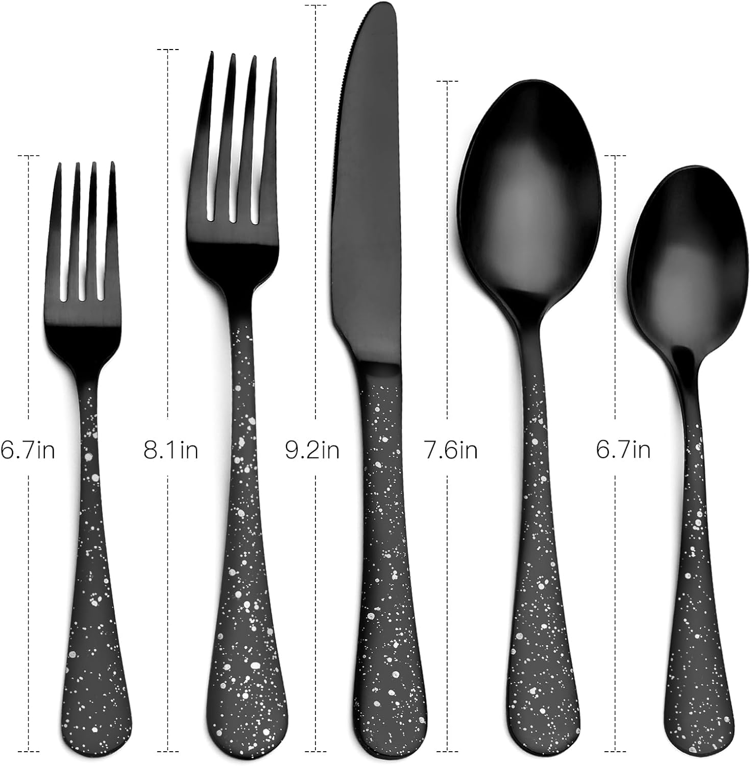20-piece stainless steel silverware set service for 4 -This matte silverware set of tableware contains 4 dessert forks, 4 dessert spoons, 4 table knives, 4 table forks, 4 table spoons,All tableware are designed according to ergonomics, suitable weight and comfortable placement, suitable for any scene, creating the most comfortable dining experience for you. product features -Ergonomic handles and high quality workmanship -Dishwasher cleaning is easy and convenient -Matte black stainless steel silverware looks upscale and elegant -starry sky inkjet series High-quality materials -This silverware set uses 18/0 stainless steel, the best materials and craftsmanship, satin-finished high-standard production process, no rust, and not easy to bend. This makes its surface smooth, easy to hold, and improves the dining experience. Starry Design -For this set of stainless steel silverware, we used a brand new starry sky inkjet design. From packaging to production, we spent a lot of thought. The ergonomic design makes its weight and balance perfect, and it is easy to hold, providing you with an unprecedented dining experience Dishwasher Safe -You can safely put it in the dishwasher for cleaning, because its production process and materials are the best, so that it will not fade or produce debris Warm tip -Please clean it with warm water for the first time -Please clean and dry the silverware after using it -Don’t use any hard cleaning tools to clean him O.C.E. makes you have a more refined dining experience