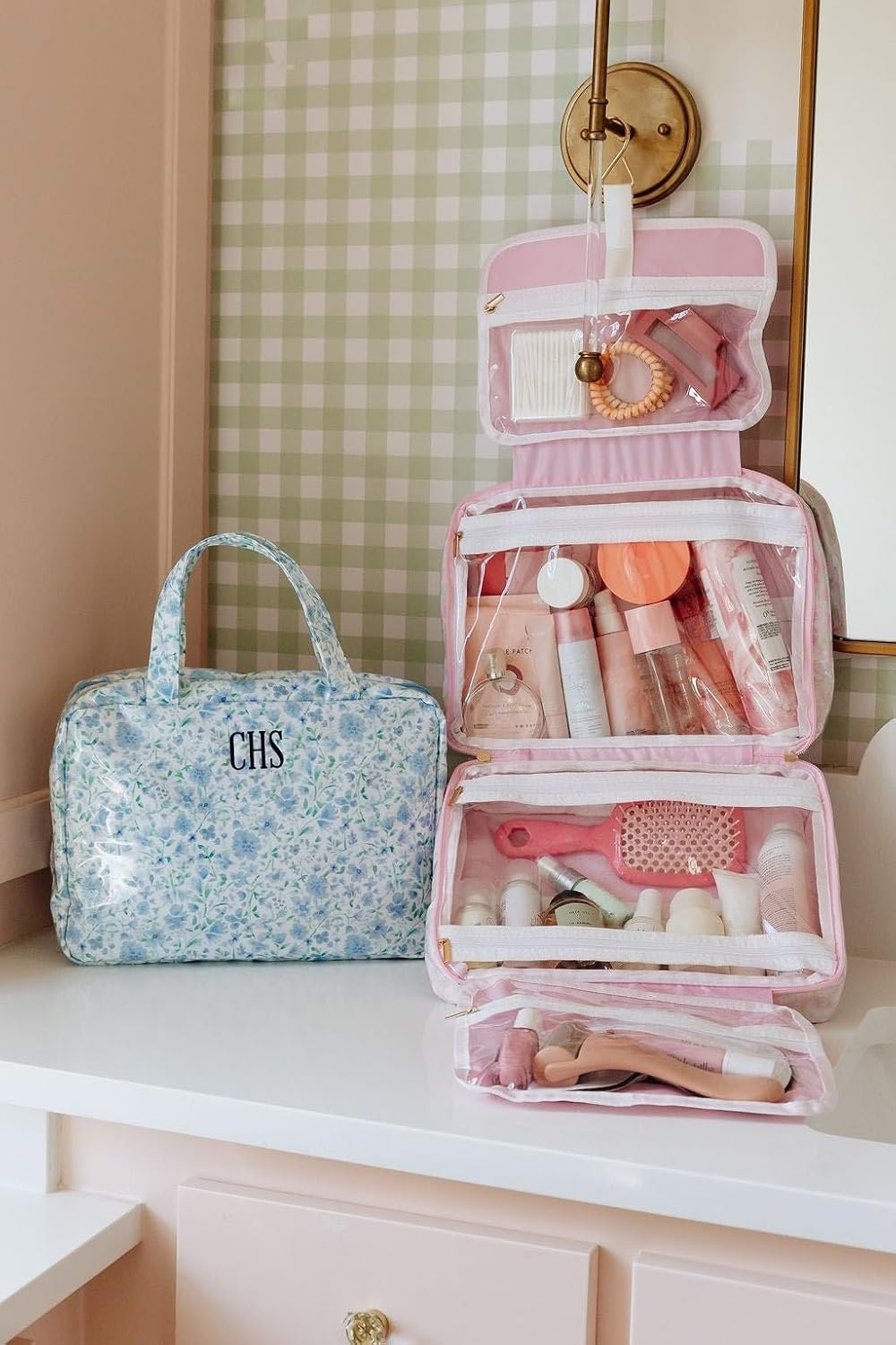 UPGRADE YOUR TRAVEL ROUTINE. The Hanging Toiletry Bag combines watercolor elegance with everyday utility. Featuring our signature patterns and your custom monogram, this embroidered travel bag brings beauty and personalization to your packing routine. ORGANIZED INSIDE AND OUT. Unfold the bag to reveal four clear zippered compartments and elastic loops that keep your beauty must-haves and full-size toiletries neat and visible. Hang it up in a hotel, gym, or bathroom, or fold it flat for easy packing. The clear-coated finish wipes clean so it stays fresh trip after trip. THOUGHTFUL DESIGN, MADE TO LAST. From the premium embroidery to the structured shape and durable vinyl exterior, every detail is built for real-life use. The personalization makes it a one-of-a-kind gift or practical luxury just for you. MADE BY HAND, SHIPPED WITH CARE. Every bag is handmade and personalized in Dallas, TX by our women-led team. Whether you're treating yourself or gifting someone special, youโll love the fast turnaround and careful craftsmanship. PRODUCT DETAILS: Exterior: Nylon with plastic-coated vinyl. Interior: Easy-clean lining. Closure: Nylon zipper. Compartments: 4 clear interior zip pockets with elastic loops. Folded Size: 13" x 10.5" Unfolded Size: 39" x 10.5"
