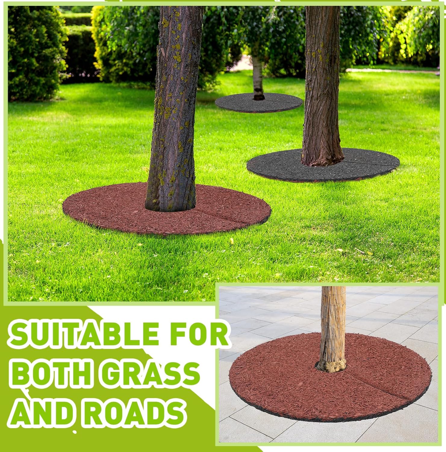 Features: Helps reduce the need for constant weeding and mulching, saving time and effort in your garden care routine. Designed to withstand outdoor elements like rain, sun, and wind without cracking or degrading over time. Specifications: Material: rubber Color: red, black Size: about 30 inches in outer diameter, about 3 inches in inner diameter, and about 0.59 inch in thickness Package includes: 6 x Rubber tree mulch rings Notes: Manual measurement, please allow slight errors on size. The color may exist a slight difference due to different screen displays.
