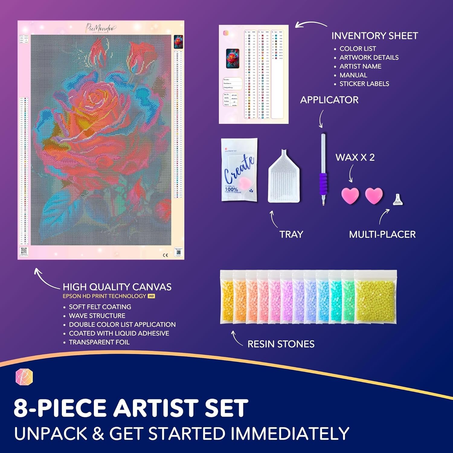 | Included Components | assorted colour diamond stones, application pen, wax, bowl, resealable bags |