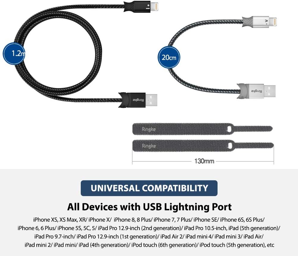 Ringke 8 Pin Braided Nylon Smart Fish Data Charging Cable (2-Pack) (4ft) to USB A Port Tangle Free High Speed Charging Sync 3.0 Connector Cord MFi Certified ACFI0005 - Black & Gray