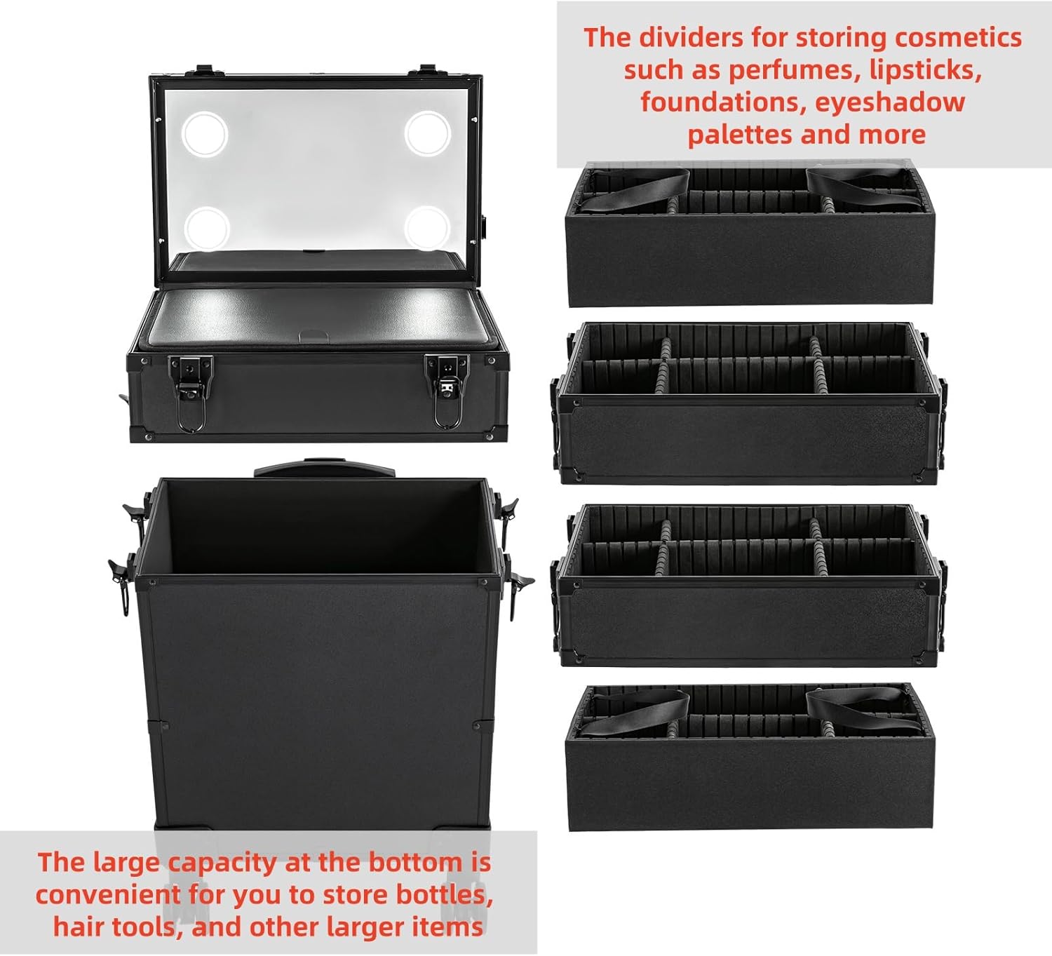 Multiple Power Sources: This product comes with a 3.3ft long USB cable and a 4.92ft long power cable, which reduces the limitation of the use of the site, allowing both indoor and outdoor useHighly Portable: The easy-to-move universal wheels, three-position telescopic trolley rod, and a top handle make it easy to move the case up and down stairs, in and out of the car, and in the liftEasy to Assemble: Simple structure and minimalist design mean you don't need other additional installation, you just need to install the universal wheels and start to use them2 Keys: The configuration of two keys prevents the worry of losing or forgetting one key. It also enables you to open the case easilySpecifications: Material: Plastic, Aluminum Alloy, PVCColor: BlackShape: RectangularAssembly Required: YesMounting Type: Floor StandingWheel Type: Removable Universal WheelCarrying Method: Hand-held, Hand-pulledLight Source: 4*LEDsLight Colour: White, Yellow, NeutralColour Temperature: 3000-6500K Voltage: 12VPower: 20WLoad Bearing Capacity: 30kg /66.1lbsNumber of Tiers: 5Plug Type: US StandardUSB Cable Length: 1m/3.3ftPower Cable Length: 1.5m/4.92ftTelescopic Rod Extension Height from Case: 20cm/7.87inLED Functional Area Height: 5cm/1.97inSecond Box Height: 8cm/3.15inThird Box Height: 8cm/3.15inFourth Box Height: 9cm/3.54inBottom Box Height: 37cm/14.57inOverall Product Size: 37.5*24.5*67cm/14.76*9.65*26.38inGross Weight: 9.57kg/21.1lbsNet Weight: 8kg/17.6lbsPackage Size: 78*42*31cm/30.7*16.5*12.2inPackage Included: 1*Rolling Makeup Case 4*Universal Wheels2*Keys1*USB Cable 1*Power Cord