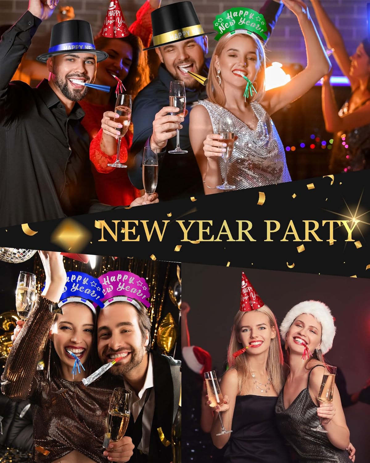 Features: These new year party hat is lovely and exquisite, which is photo prop to bring you many unforgettable and meaningful New Year photos, making your photos gets more likes in media. New year eve party hats are suitable for people above 15 year old, enhancing the engaging and interactive element of your New Year celebration. Specifications: Material: Top hats: plastic Cone hat: paper Noisemakers: plastic Main color: red,yellow,purple,green,blue Size: as shown Package includes: 10 Pieces of top hats 22 Pieces of cone hats 18 Pieces of tiaras 35 Pieces of blowouts 15 Pieces of horns Notes: Manual measurement, please allow slight errors on size. The color may exist a slight difference due to different screen displays
