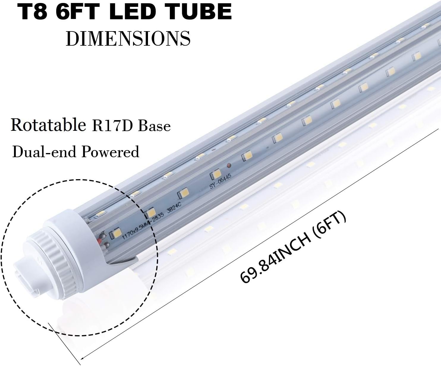 SpecificationLength: 6 foot(end to end 69.84inch) Power: 40W CCT: 6000K Luminous Flux: 110lm per watt Color Rendering Index(CRI): 85 Lamp Power Factor: 0.95 Input Voltage: AC110~277V Features: No buzzing ballasts. Frosted cover for anti-glare eye protection.