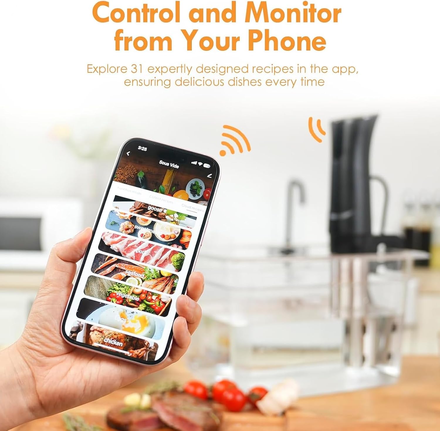 Product Description: 1100 watts of power for rapid water heating and thermometer control keeps the water at a constant temperature, thus ensuring that the heat penetrates throughout the food from all angles, allowing the food's own nutrients to be preserved. Maximizes the natural moisture, flavor and tenderness of the food! Specification: Product name:Sous Vide Machine Power:1100W Rated voltage:110/ Temperature Control:25°C-95°C Temperature control accuracy:±0.5°C Maximum application capacity:12L Control panel: Touch key, LED display Motor speed:1500rpm Motor noise:≤50dB(50cm from high body) Net weight:1.1kg Size:383*72*72mm Gross weight:1.4kg Packing list: 1* Host 1* Power Cord 1* Fixed Clamp Bracket 1* Instruction Manual