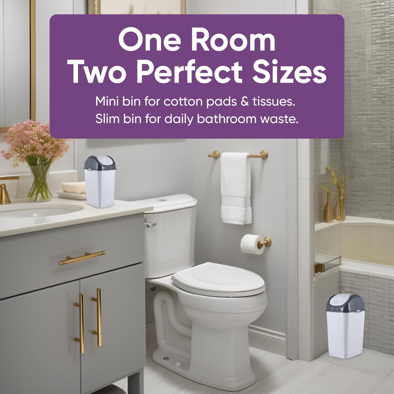 Introducing the set of Mini 1.25 Gallon and Small 2.5 Gallon Plastic Trash Can with Swing Top Lid. Look no further than the Superio Swing Lid Trash Can! Made from high-quality plastic, this trash can is built to last and is perfect for use in any home or office setting. The swing lid design is perfect for keeping trash out of sight and odors under control. The lid can be easily opened with one hand, making it convenient for busy individuals on the go. The Superio Plastic Waste Bin also features a sleek and modern design that complements any décor in your kitchen, bathroom, bedroom, office, or dorm room.