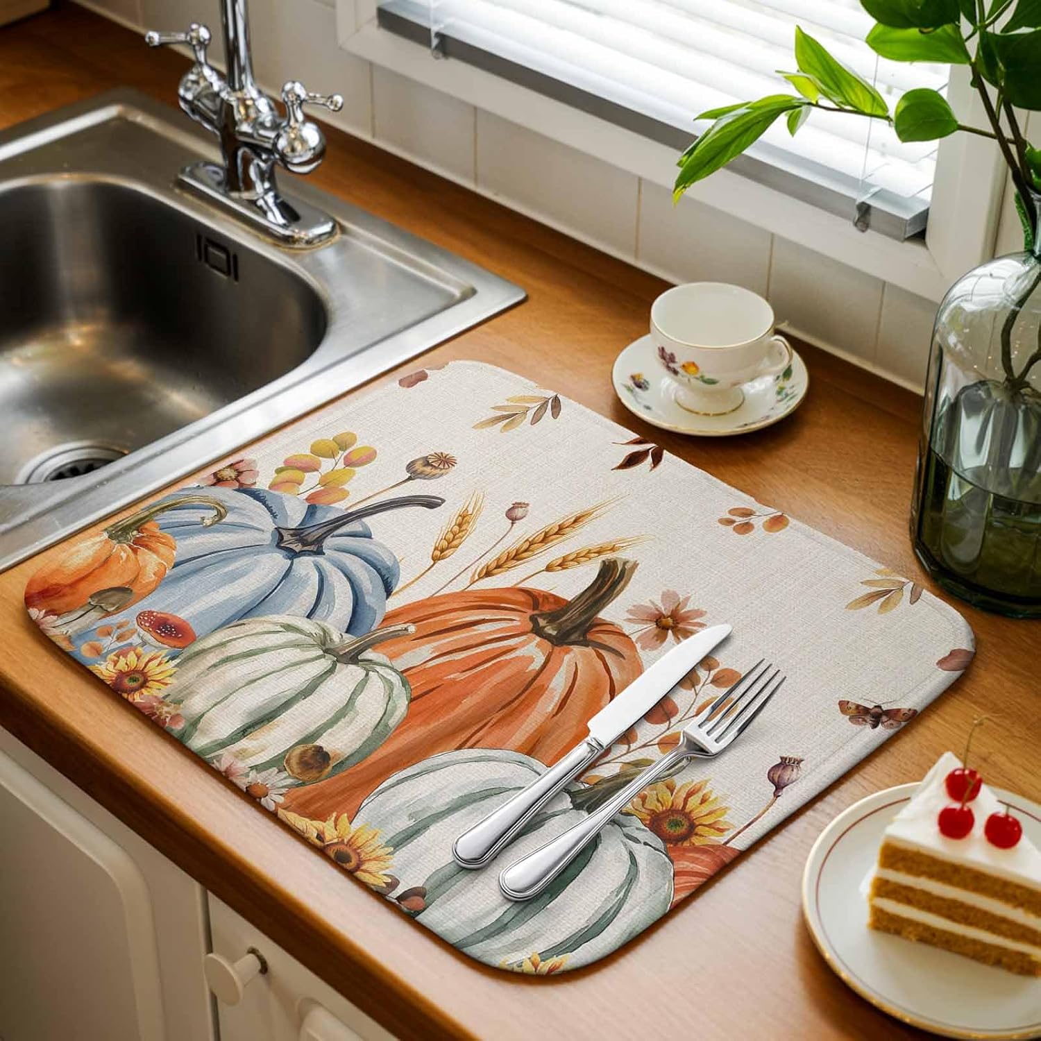 Maybe you wash most of your items in the dishwasher, but some crystal vases, glasses, and delicate items, as well as pots and pans and other items that don't fit in the dishwasher, need to be hand washed.A soft dish drying mat is a good option for handwashing.♫High Quality Drying Mat- The surface of the drying mat for kitchen counter is composed of soft microfiber material.- Dish mat with elastic sponge interlayer, high water absorption.- The bottom of the dish mats for counter is made of natural rubber, which is environmentally friendly and non-slip.♫Drying Mat For Kitchen CounterDish mat drying kitchen mat placed on the countertop quickly absorbs water splashes while washing dishes at the sink, avoid water spots from running into the cabinets.♫Drying Mat For TableDry mat for dishes can be used as placemats to isolate high-temperature food and avoid tableware from scratching the tabletop to protect the integrity of the tabletop.♫Dog Dish MatRustic dish drying pad can also be used as pet utensils pads to avoid stains from seeping into the ground after pets overturn the food while eating, reducing the time for housework.♫Mouse PadPortable dish drying mat works great with the mouse, absorbs drips from a frosty drink, cushions your arm against the hard table top, and has plenty of space left over for a notepad and pencil jar.♫Coffee Maker MatDish mat drying quickly capture coffee splatter and protect expensive kitchen countertops and other interior surfaces from coffee splatter or coffee bean stains.♫Great Gift IdeaFarmhouse dish drying mat is the best gift for family and friends because of its stylish design and strong water absorption, suitable for housewarming, birthday parties, weddings, Christmas, Thanksgiving, St. Patrick's Day, Easter Holidays, Valentine's Day, Independence Day, etc.