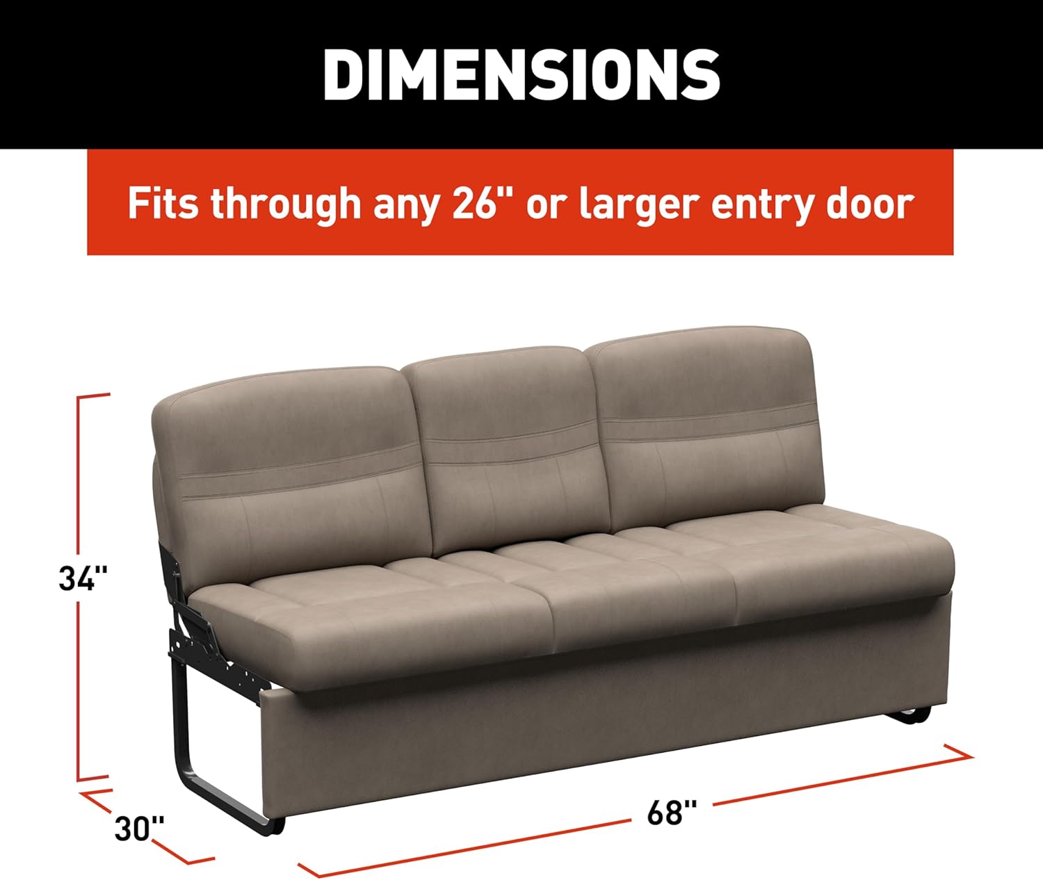 The Thomas Payne Signature RV jackknife sleeper sofa offers a perfect blend of style and functionality. Designed to save space, it transitions effortlessly from a sofa to a bed, giving you more room to relax or rest. When folded up, it measures 20 inches in depth, extending to 42 inches when fully opened for sleeping. Crafted with high-density foam cushioning, this camper sofa delivers plush comfort for lounging or sleeping. A fold-down center console with dual cupholders keeps beverages within reach. Choose from three PolyHyde vinyl color options — Driftwood, Satula, and McCoy — or opt for the Dellmead woven fabric finish to complement your RV’s interior. A matching kickboard is included, with an optional leg kit for added support and personalization. With easy-to-clean, low-maintenance PolyHyde vinyl, this RV sleeper sofa offers lasting luxury. A 7-year Hydrolysis limited warranty backs the PolyHyde vinyl fabric, ensuring long-term performance and peace of mind. Built for versatility and comfort, the Thomas Payne Signature RV jackknife sleeper sofa is an ideal upgrade for any RV interior.
