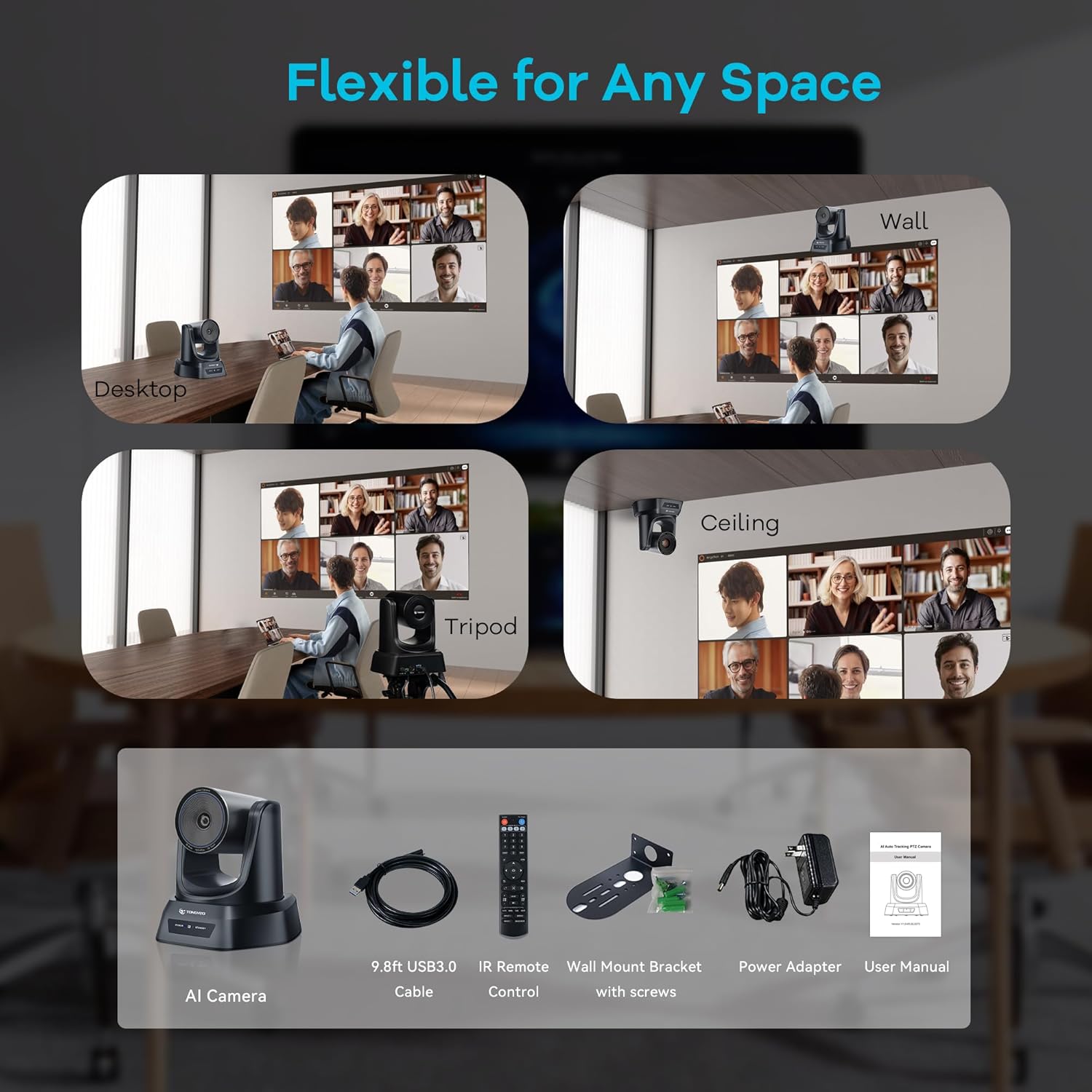 | Features | AI Auto-Tracking, PTZ Camera with 3X optical zoom, 1080P 60fps, 350ยฐ Pan & 90ยฐ Tilt, HDMI+USB3.0 plug and play, Remote Control, RS232/RS485 Support |