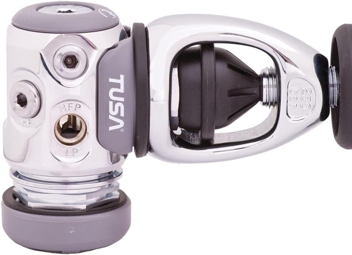 The TUSA RS-790 regulator is a high-quality regulator designed specifically for scuba diving. Its first stage regulator is made of marine brass that is chrome plated, and its design is a balanced diaphragm that is environmentally sealed. This means that the internal mechanism is protected from contamination from external elements such as salt, sand, chlorine, or pool acids that can corrode and deteriorate regulator performance.To further enhance the regulator's performance, TUSA has added a dry ambient pressure chamber to prevent water from entering the main spring cavity. This chamber maximizes the regulator's performance in cold water diving conditions below 50 Degree F (10 Degree C). Additionally, the outside of the chamber is ribbed, which increases the surface area and acts like a radiator to transfer heat further, reducing the problems associated with cold water diving.The first stage has four low-pressure ports and two high-pressure ports, with the high flow low-pressure ports positioned near the diaphragm, which increases airflow by up to 15%.The second stage is pneumatically balanced, with a small chamber that traps air and forces the poppet back against the intermediate pressure orifice, providing smooth breathing in all conditions. The regulator is lightweight and compact, making it easy to carry and use during diving sessions.It also comes with a Venturi adjustment lever that has two positions selectable by the diver, and a silicone