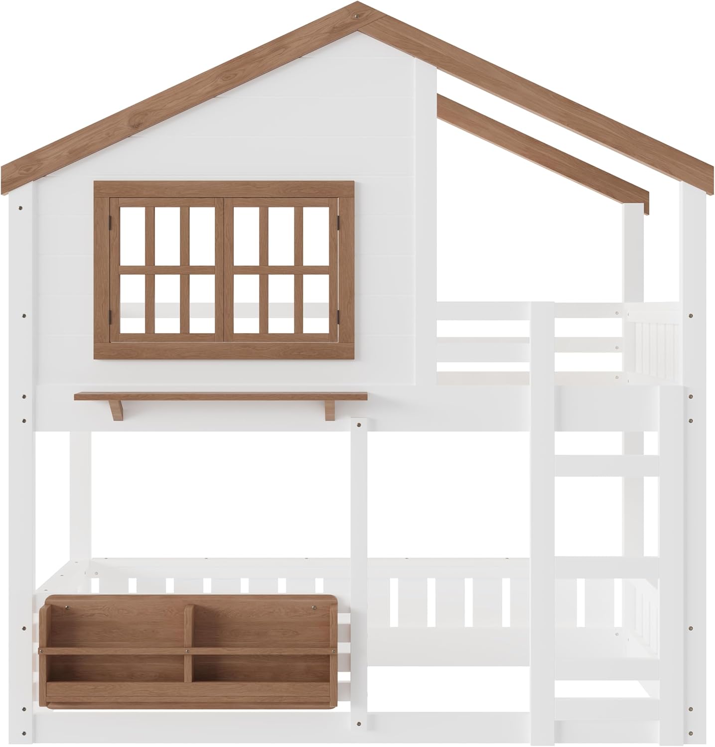Twin Over Twin House Bunk Bed with Windows and Bookshelf, Wood House Roof Floor Bunk Bed Frame with Safety Fencing and Ladder for Teens Kids Boys Girls (Beige&Natural)