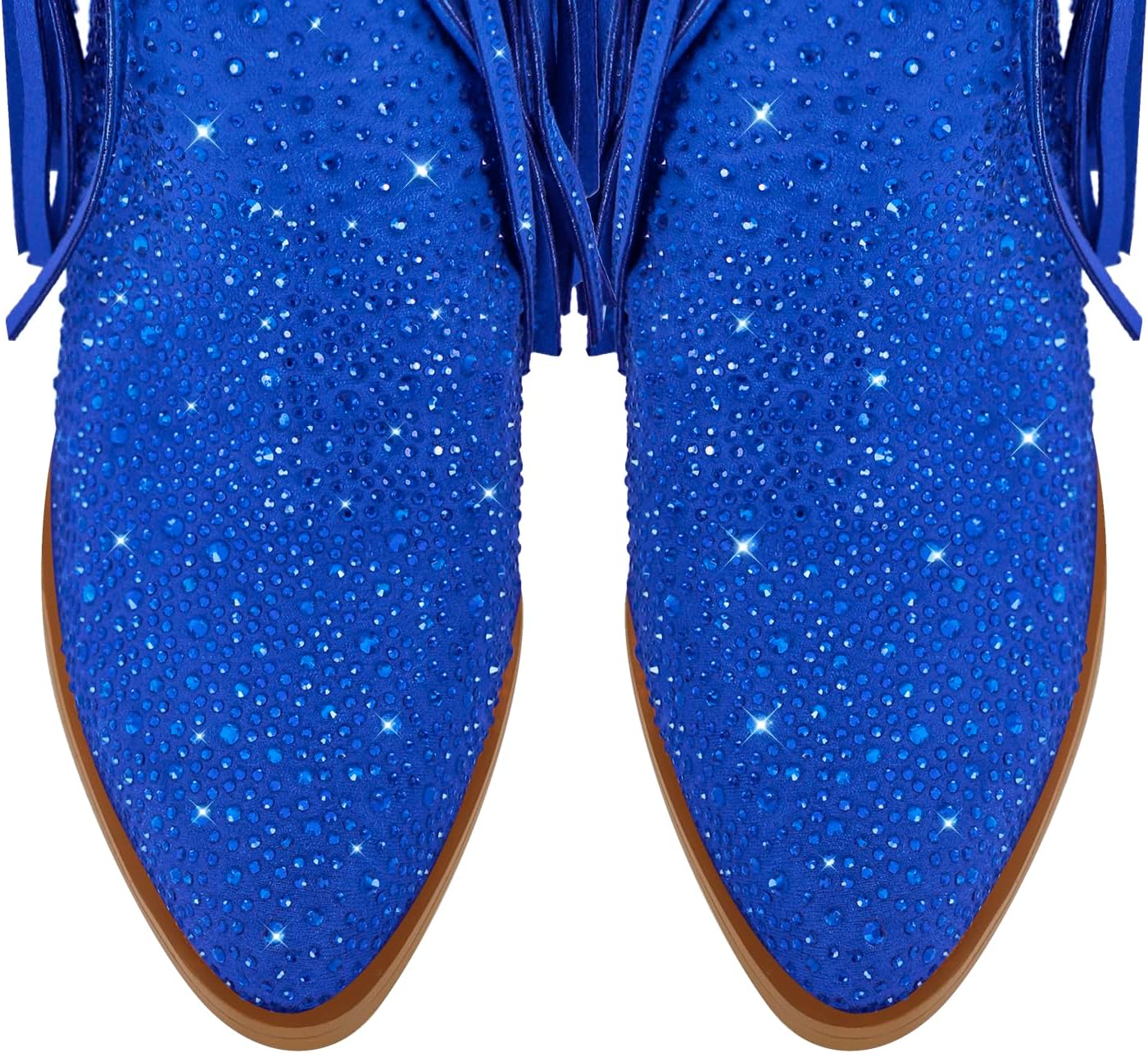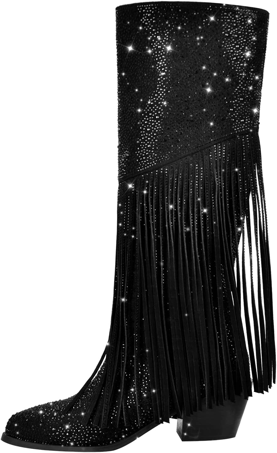 Item title: women's rhinestone embellished western boots with fringe and tassels block heels point toe sparkling party dress shoes.