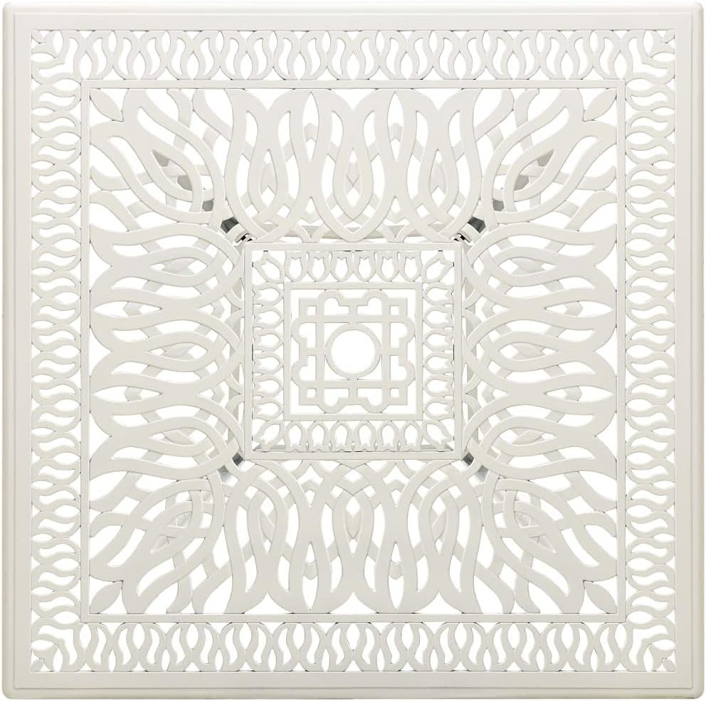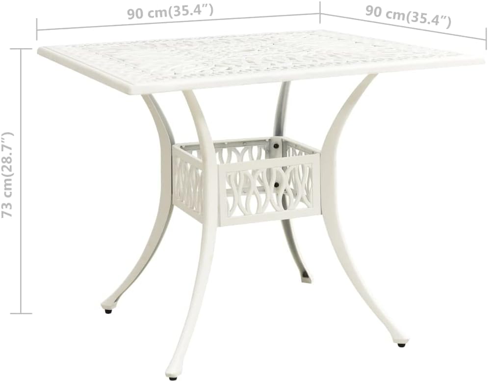 This Contemporary White Cast Aluminum Garden Table is a magnificent addition to any outdoor space, blending style with practicality. With its square shape and smooth surface, it sets an inviting scene for dining, coffee meetups, and chill sessions, making it perfect for those who love entertaining in their gardens or balconies.Stylish Design: The table has a sleek white finish paired with decorative inlays, adding elegance to your outdoor space. This look not only enhances your patio but is also versatile for various occasions.Durable Material: Made of cast aluminum, this table is tough enough for the elements while keeping its appeal. It's UV resistant for long-lasting beauty, perfect for sunny days.Weather Resistant: Whether it's sunny or drizzling, this table is made for indoor and outdoor use, meaning you can have dining experiences or coffee breaks anywhere.Ample Space: With measurements of 35.4 in x 35.4 in, this table gives enough room for up to 4 people, perfect for casual family meals or intimate gatherings. It’s a lovely centerpiece for outdoor parties.Easy Maintenance: The smooth metal surface makes cleaning a breeze, allowing you to spend more time enjoying your outdoor moments instead of worrying about upkeep.Color: White Pattern: Fancy patternsShape: SquareMaterial: Metal AluminumFinish: Painted Indoor/Outdoor: Indoor / OutdoorCover Included: NoRoom: Garden and terraceMaximum Number of People: 4Dimensions: 35.4 x 35.4 x 28.7 in (W x L x H)Surface Height: 1.2 inLeg Height: 27.6 inHole Diameter: 1.6 inWeight: 26.54 lbsDelivery Contains: Garden TableAssembly Required: YesRecommended Number of People for Assembly: 2